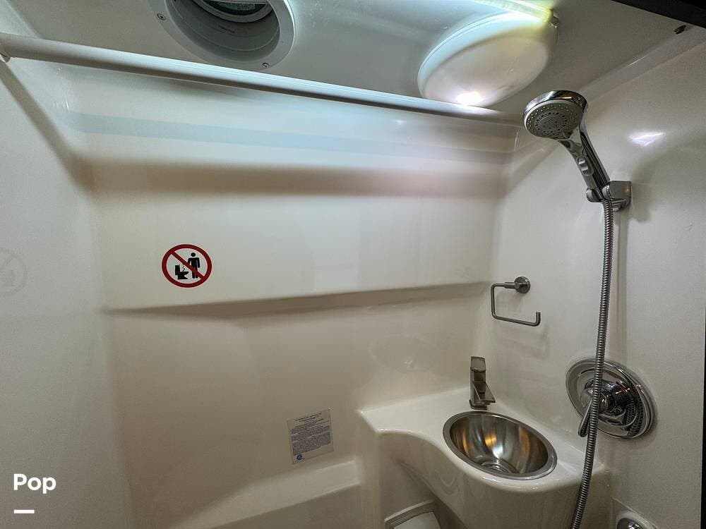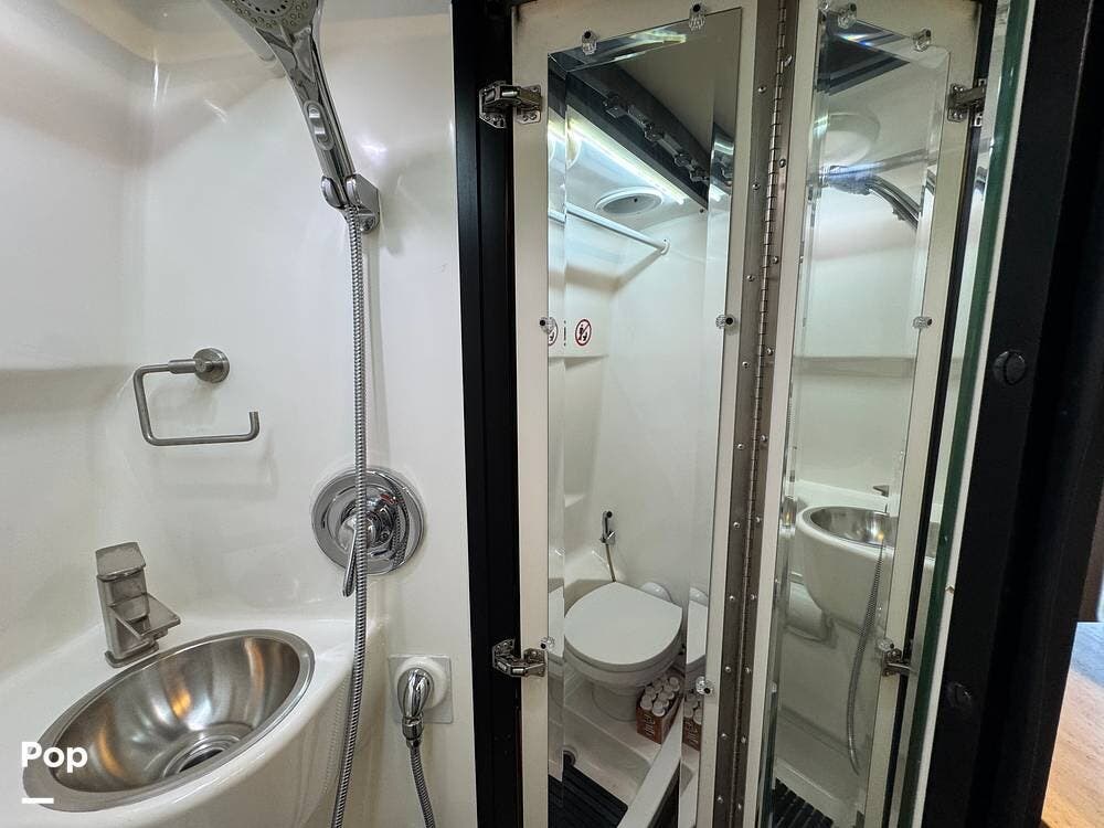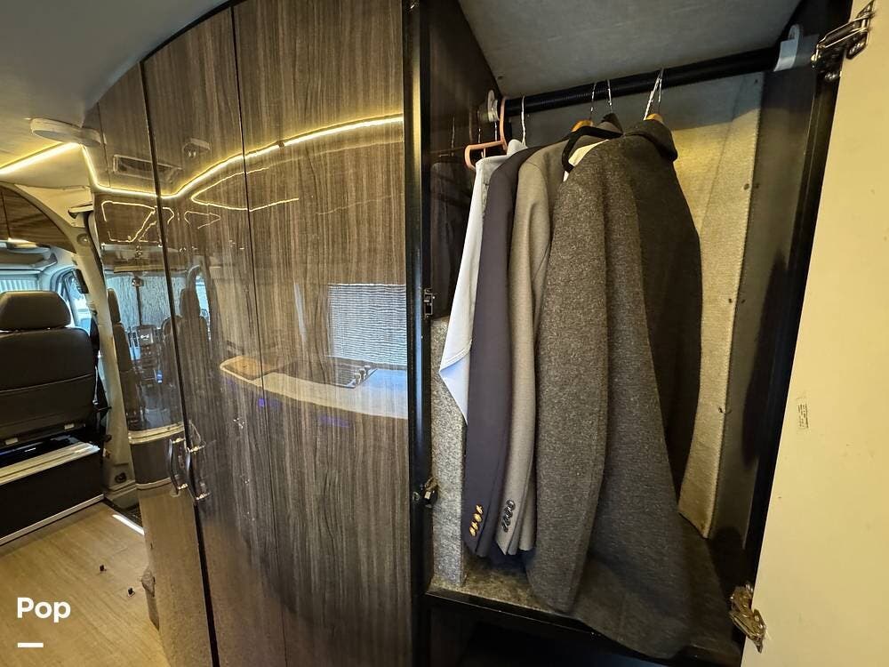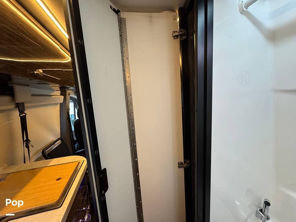 The bathroom is spacious for a Class B RV, featuring a toilet, sink, and a wet shower.