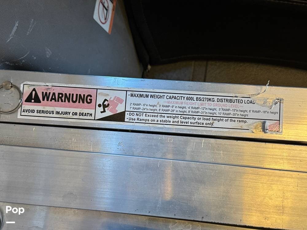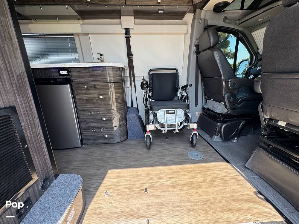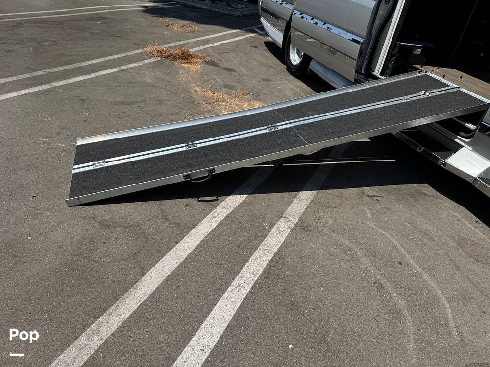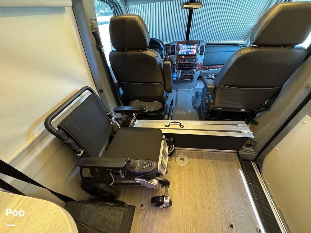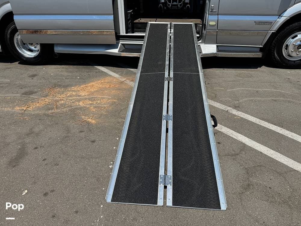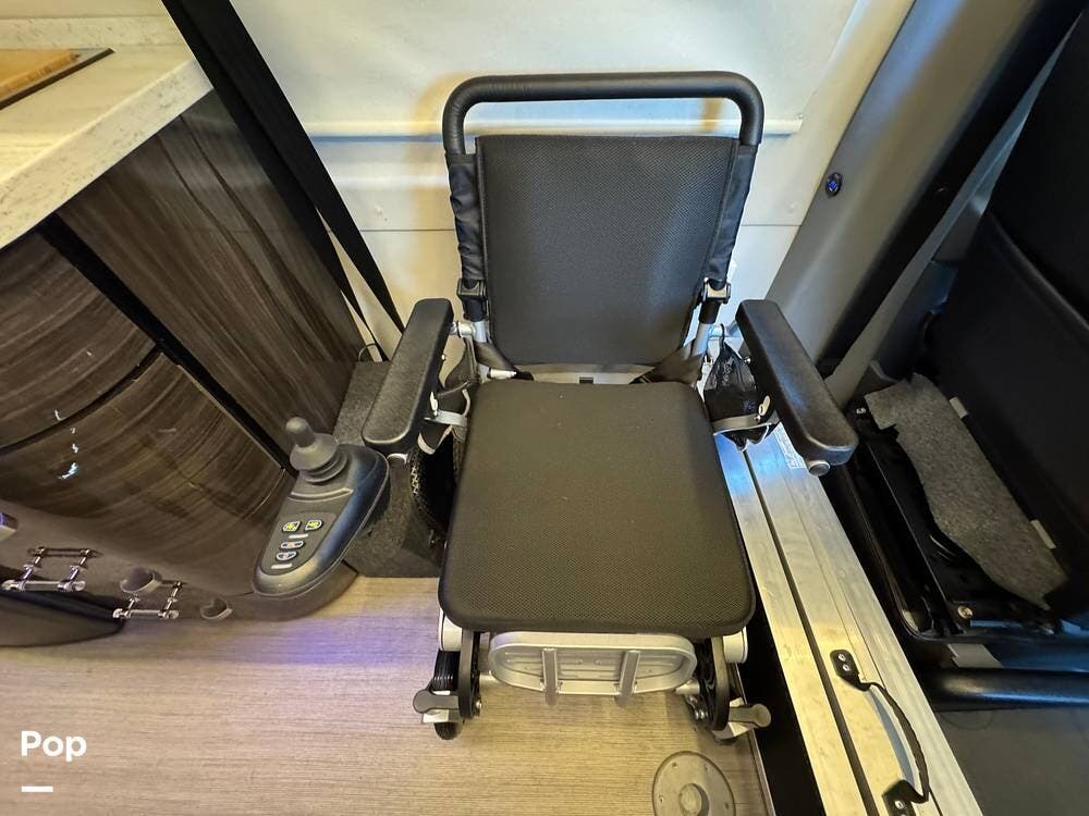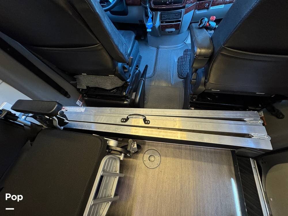 Configured initially with four captain's chairs, two have been removed to create a wheelchair-accessible interior, complemented by a wheelchair ramp and an included electric wheelchair--making this a perfect mobility-friendly RV for either temporary or permanent needs.