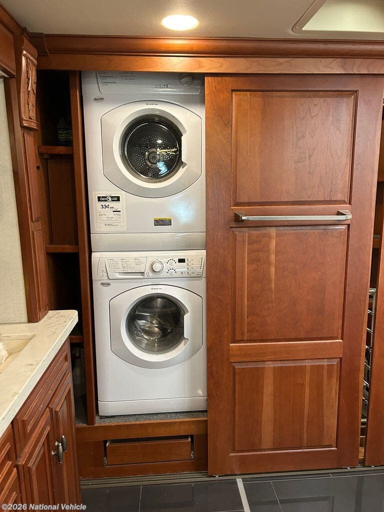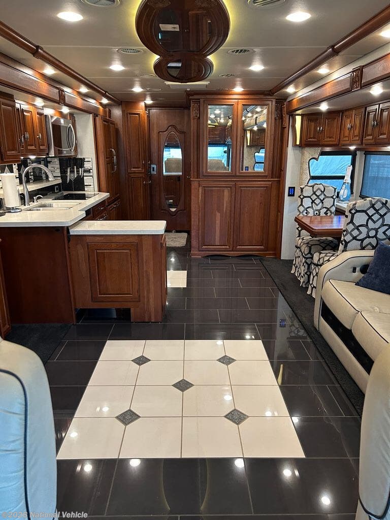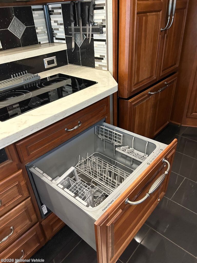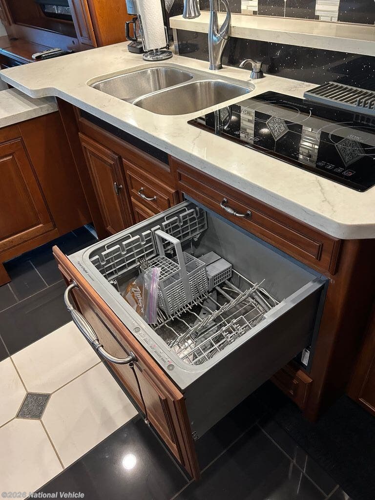 Built on a robust foundation and equipped with four expansive slide-outs, the interior opens into a beautifully appointed living space featuring high-end finishes throughout. The bath and a half layout provides convenience for both owners and guests, while the fully equipped kitchen includes solid-surface countertops, residential refrigerator, and even a built-in dishwasher?a rare luxury on the road. A stacked washer and dryer add to the residential feel, making extended travel effortless.