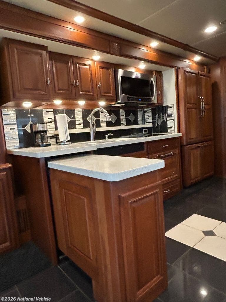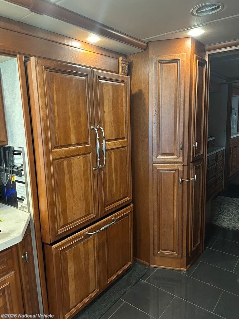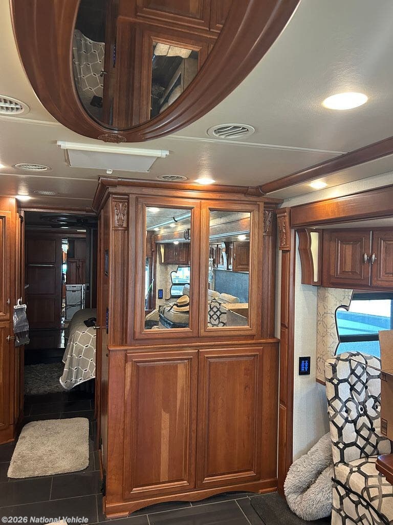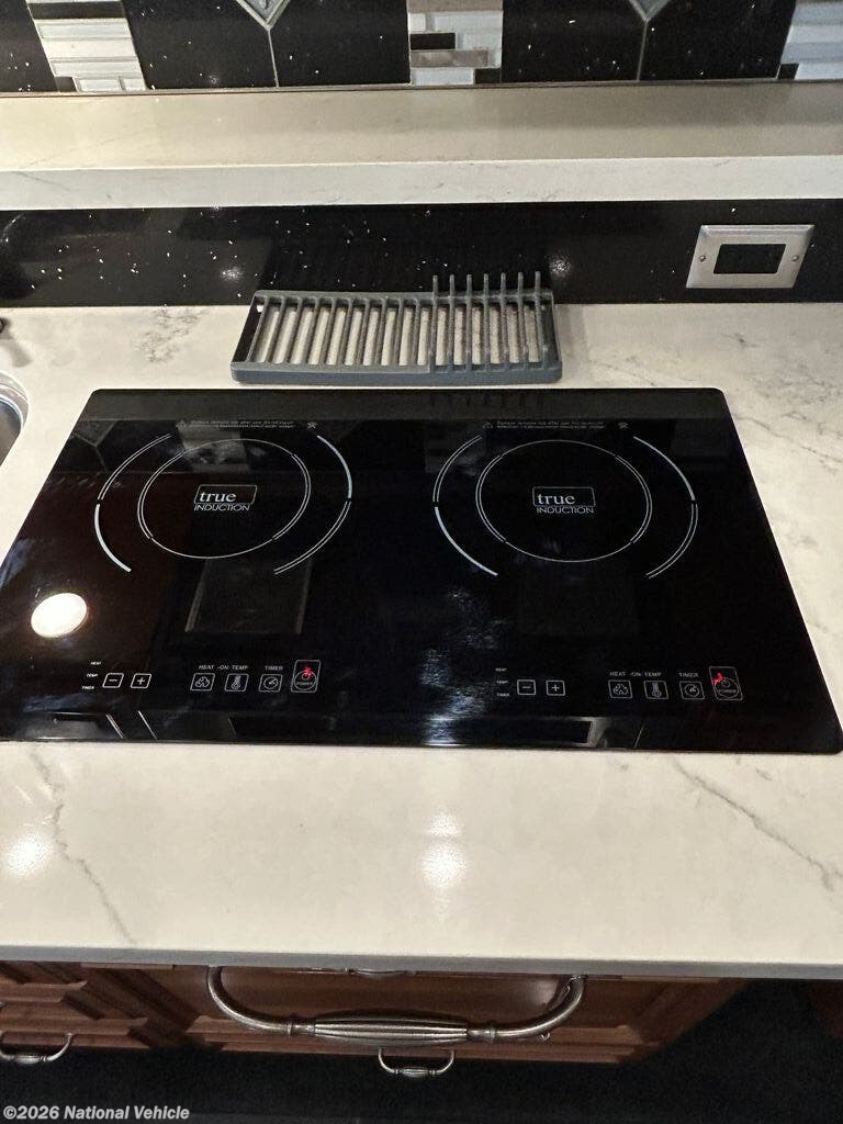 Built on a robust foundation and equipped with four expansive slide-outs, the interior opens into a beautifully appointed living space featuring high-end finishes throughout. The bath and a half layout provides convenience for both owners and guests, while the fully equipped kitchen includes solid-surface countertops, residential refrigerator, and even a built-in dishwasher?a rare luxury on the road. A stacked washer and dryer add to the residential feel, making extended travel effortless.