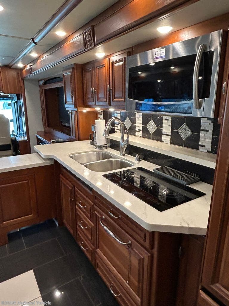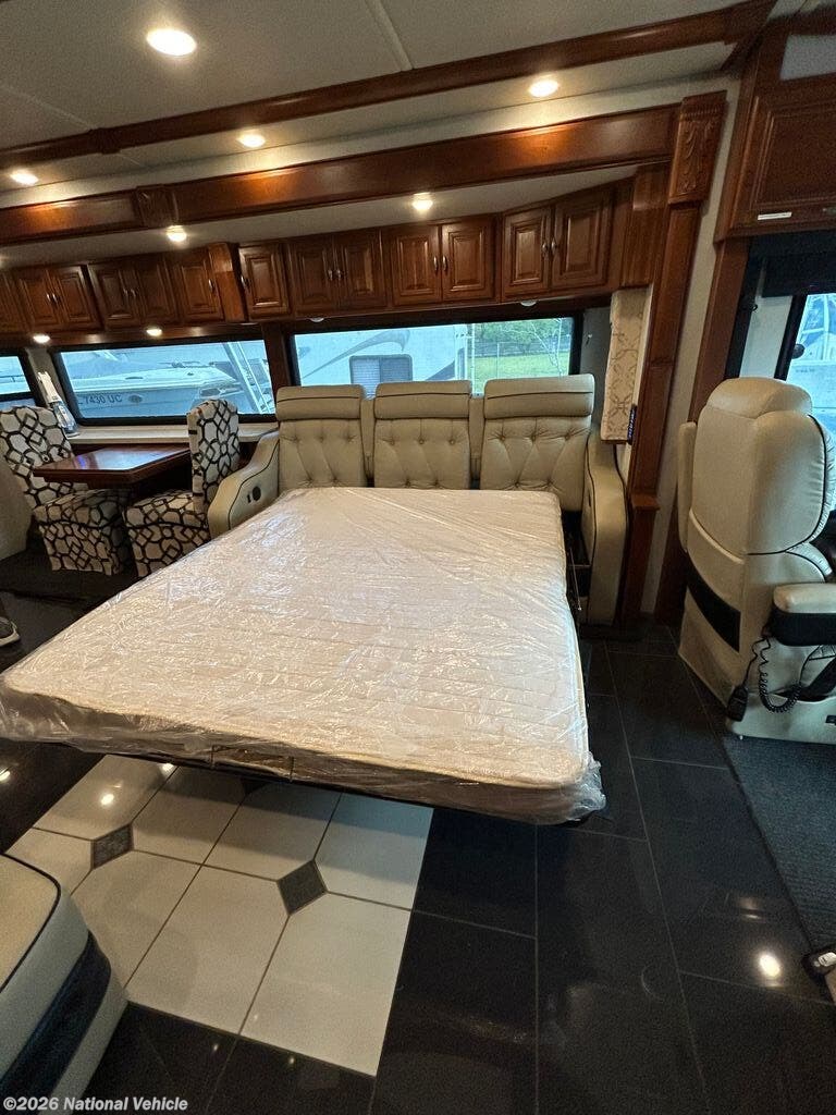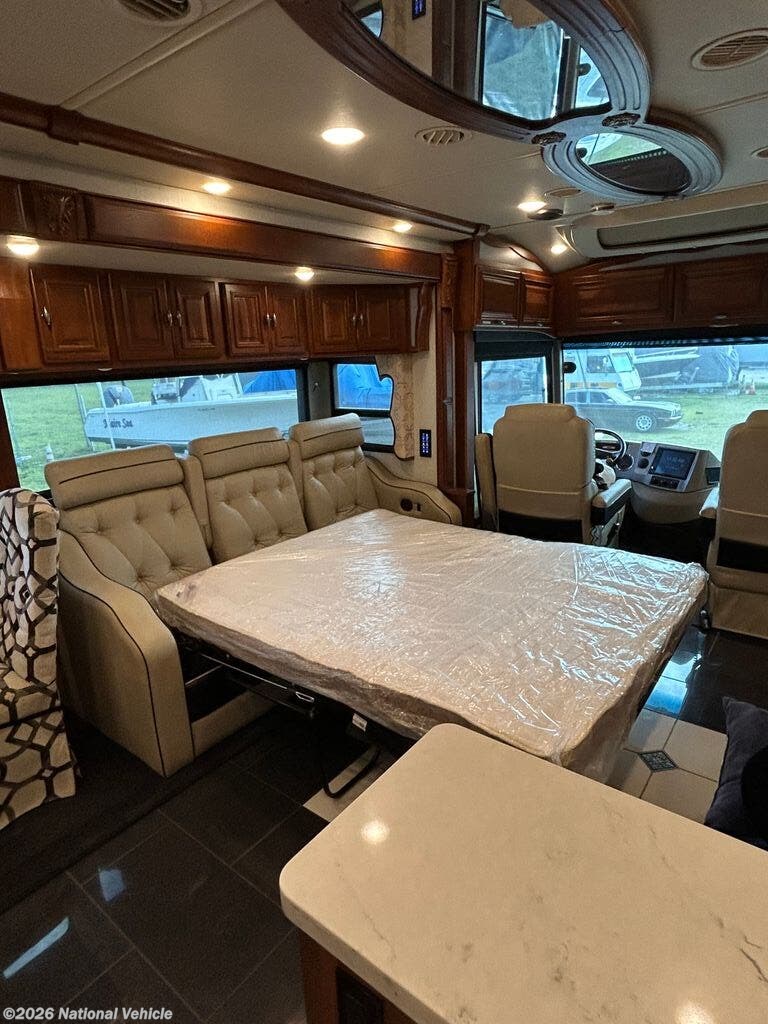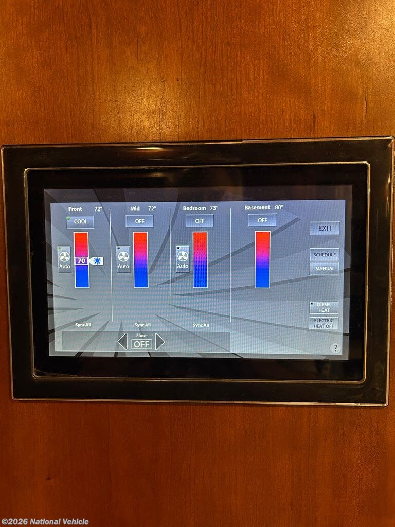 Relax in style with four flat-screen TVs, premium furnishings, and a whisper-quiet Aqua-Hot hydronic heating system, recently serviced in July 2025 for optimal performance. Comfort is guaranteed year-round with three-zone climate control featuring heat pumps. Up front, the cockpit is enhanced with Safety Plus steering control, delivering a smoother, more confident driving experience.