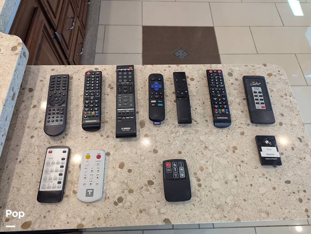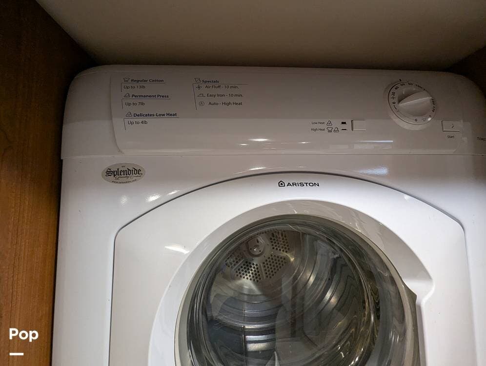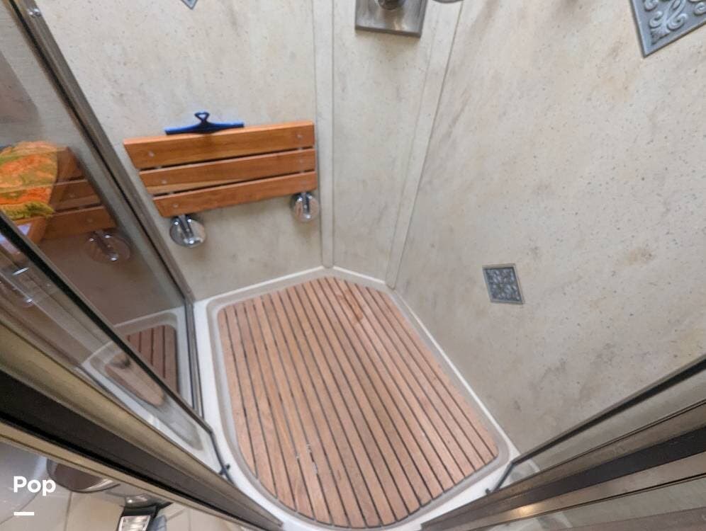 The master bedroom features a king-sized bed, plenty of storage space, and a large and flat-screen TV. The master bathroom has a large shower with a teak seat, his and hers sinks, and a stacked washer and dryer