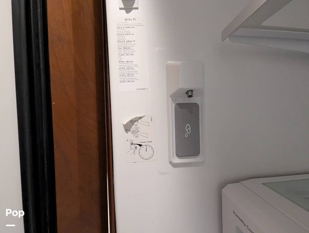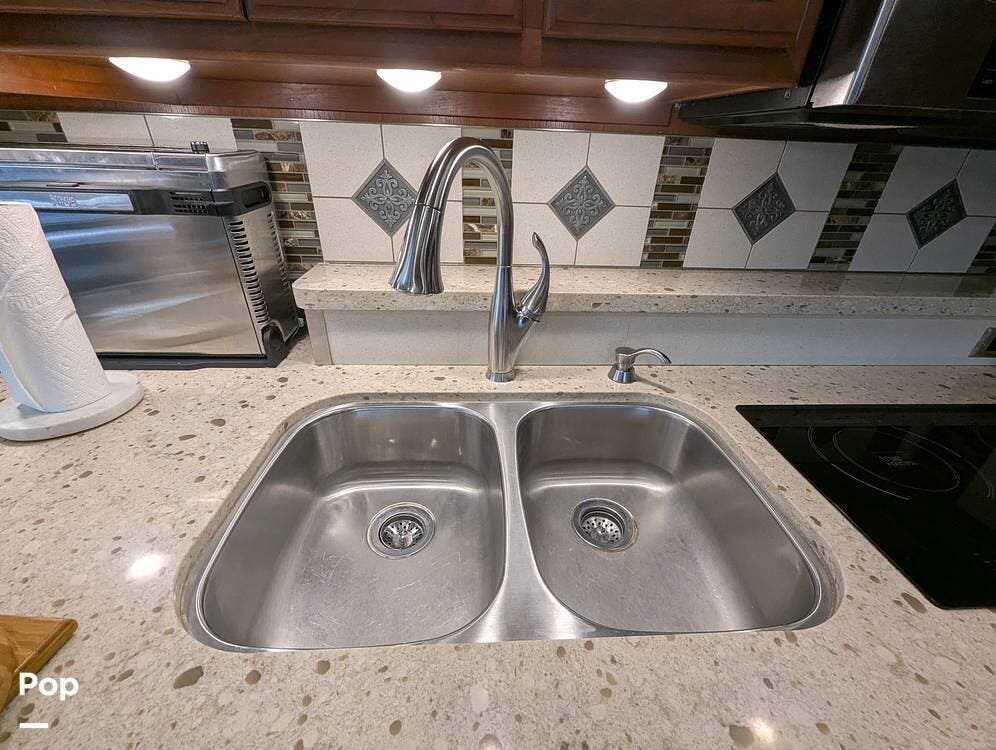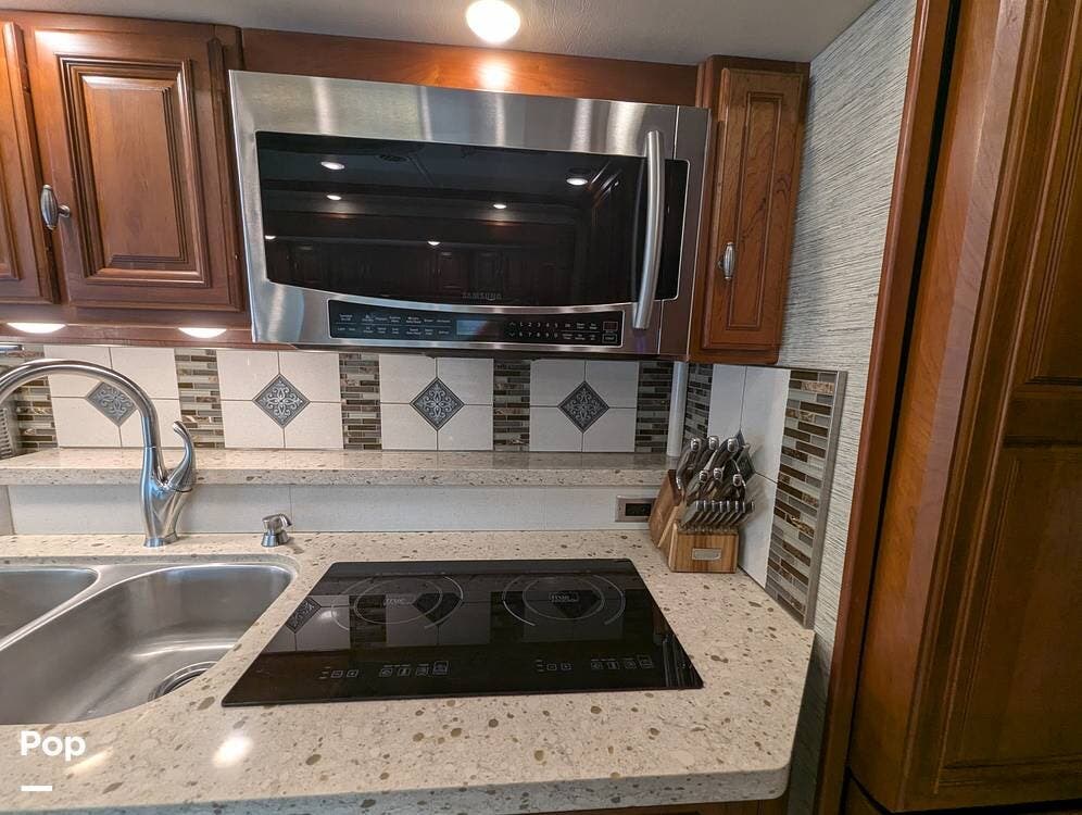 In the kitchen, you will easily be able to cook up gourmet meals or prepare light snacks. The hardwood cabinets provide nice storage, the pull-out corner Quartz counter adds to the great prep space, a residential French door refrigerator w/freezer drawer, water and ice in the door, a two-burner Induction cooktop, a large microwave convection oven, a double stainless steel sink, and a dishwasher.