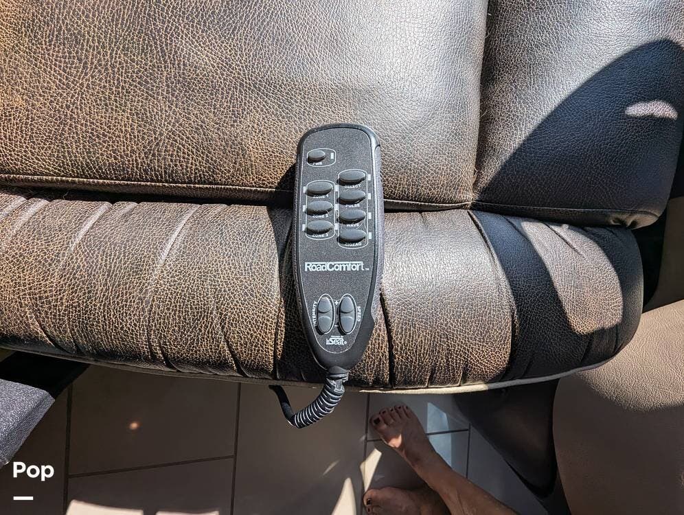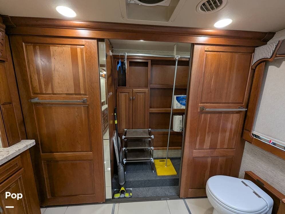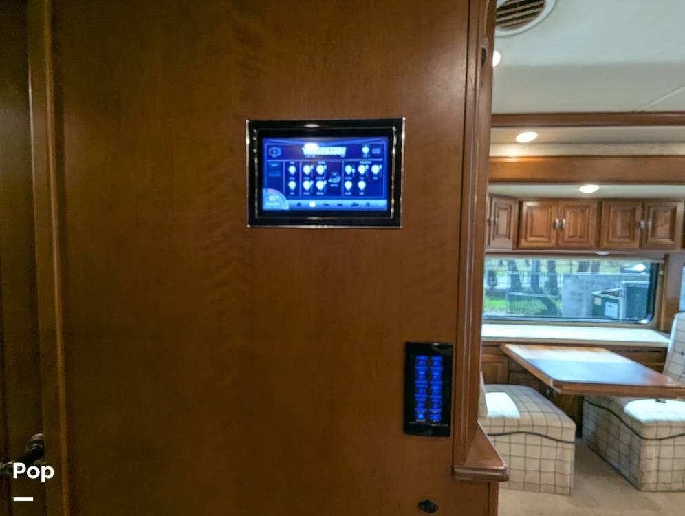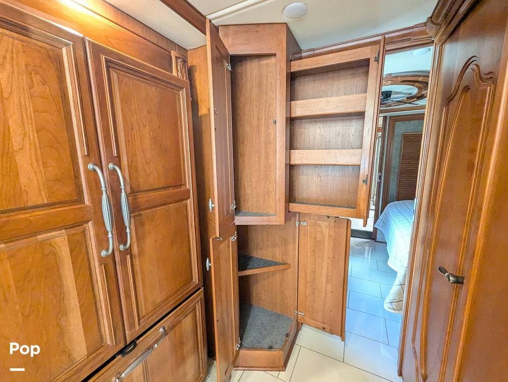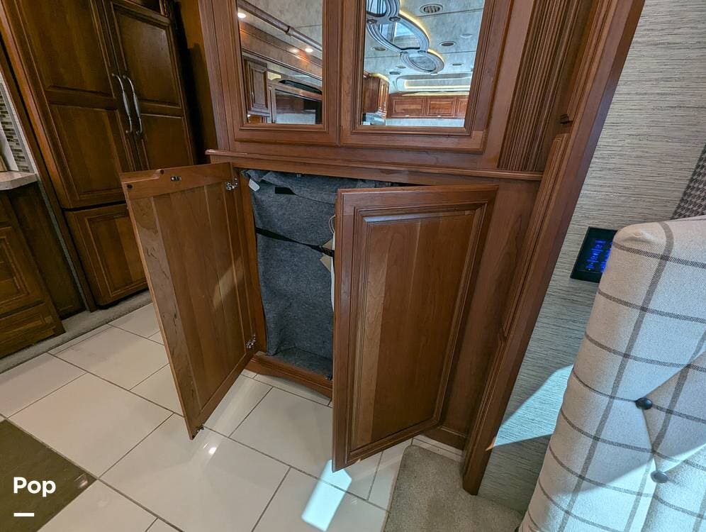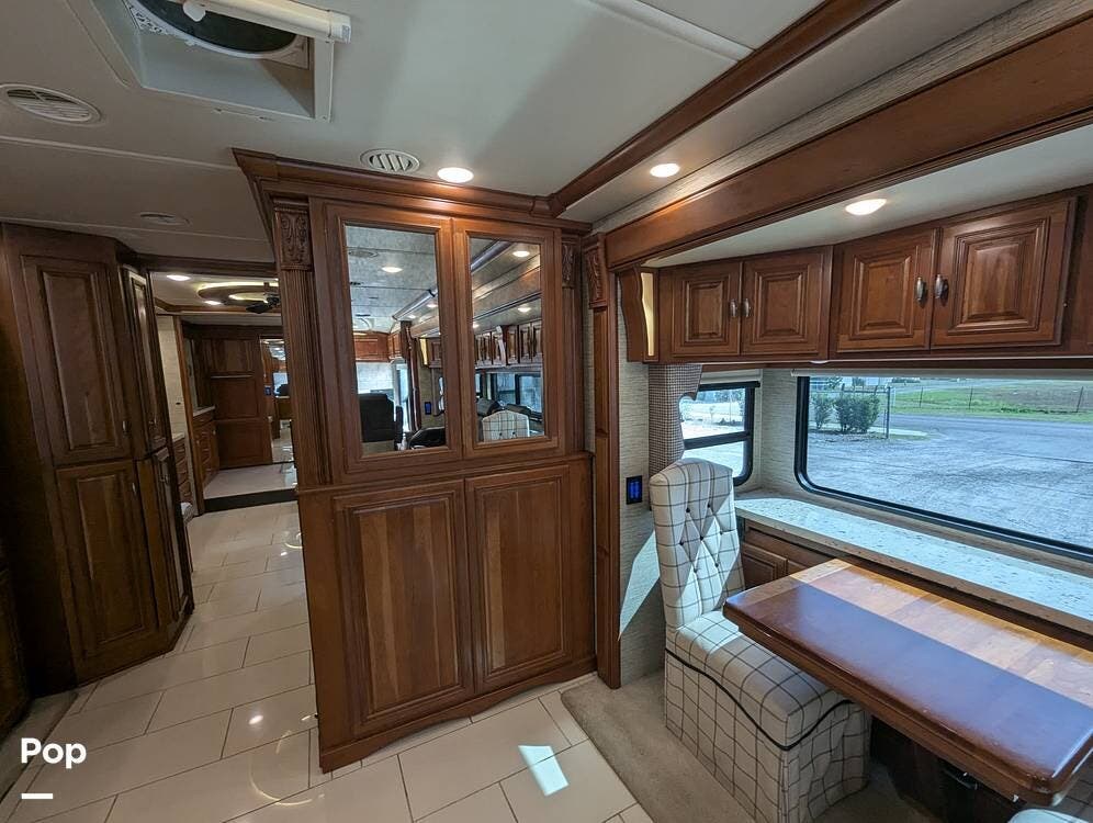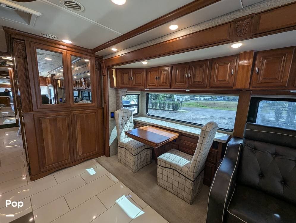 The dining table has two leaf extensions and two more chairs neatly tucked in the cabinet. There is a WiFi Pep Wave cellular router with dual modems and 4 sim cards included. Custom soft close Slide out shelves in kitchen and master bath.