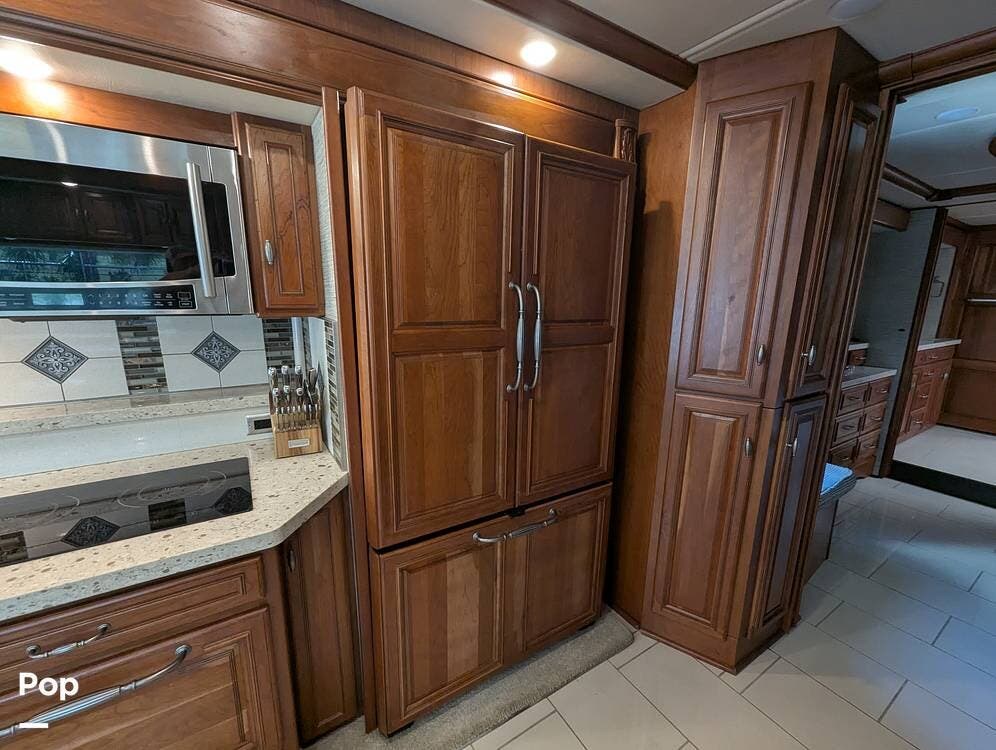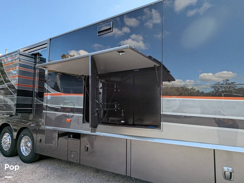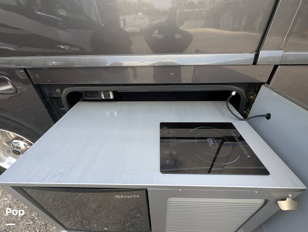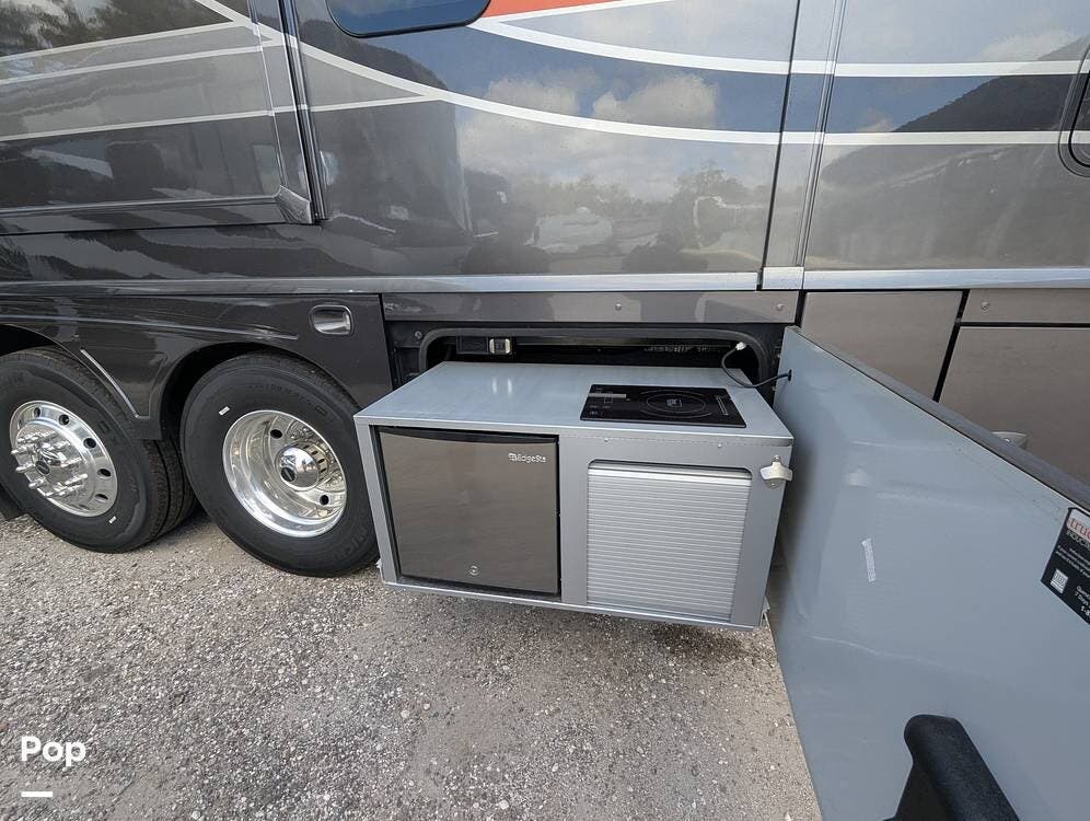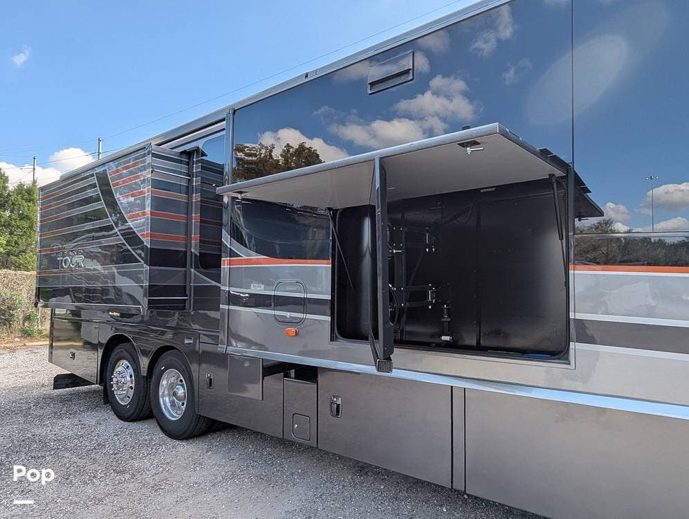 The exterior of the Grand Tour 45RL is just as impressive as the interior. The custom full-body paint job will turn heads wherever you go. The large, double-power awning provides plenty of shade and protection from the weather. The outdoor entertainment system lets you enjoy your favorite movies and music, and a 55" home theatre system shows under the stars. There is a full outdoor kitchen to keep some drinks cold while you cook dinner on the induction cooktop or grill with the central propane connection.