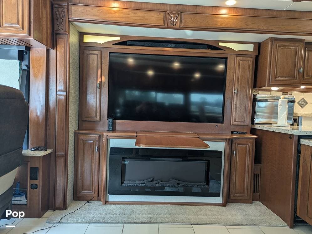The living room has plush upgraded leather seating and a state-of-the-art entertainment system with a TV on a lift. A handheld remote operates a large fireplace with an adjustable thermostat and flame. Also, you will love the wine cabinet next to the fireplace and fold-out desk/table.