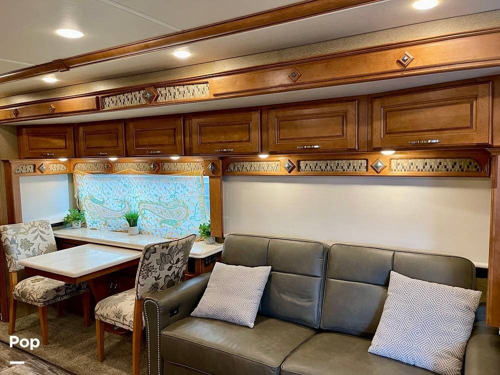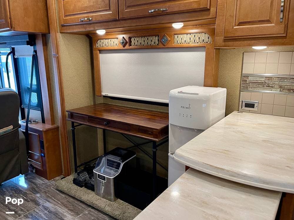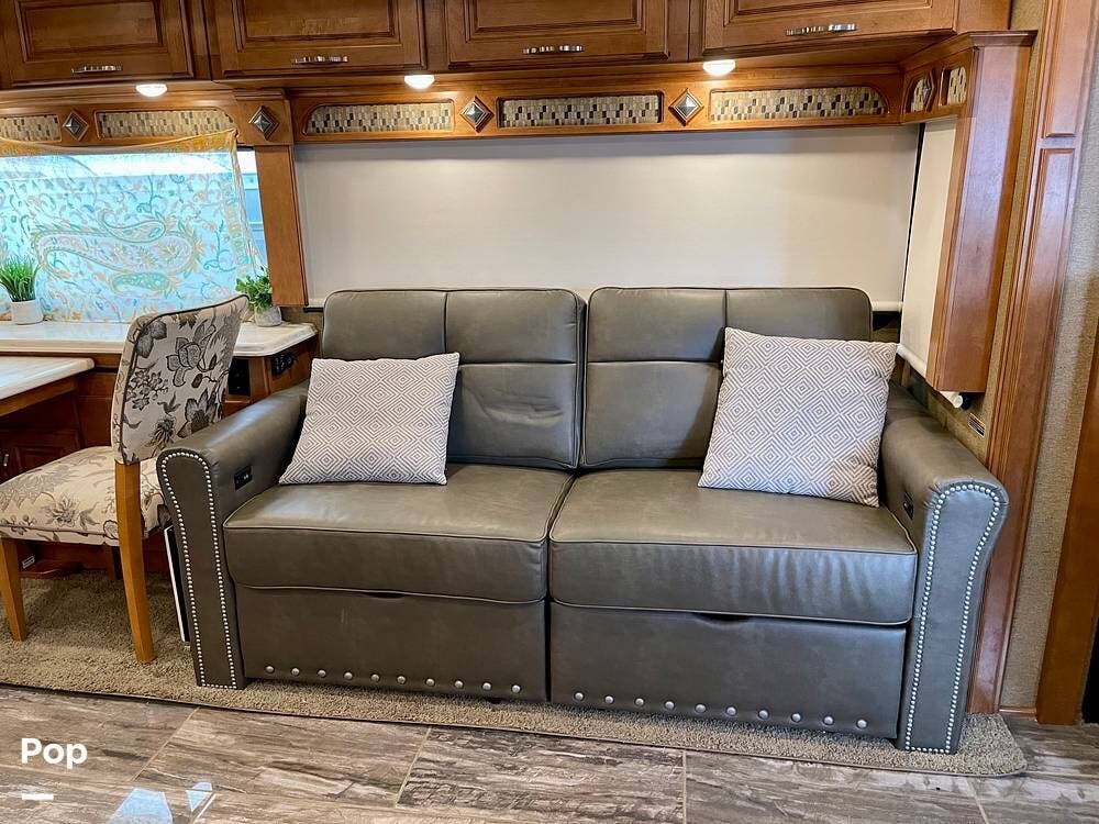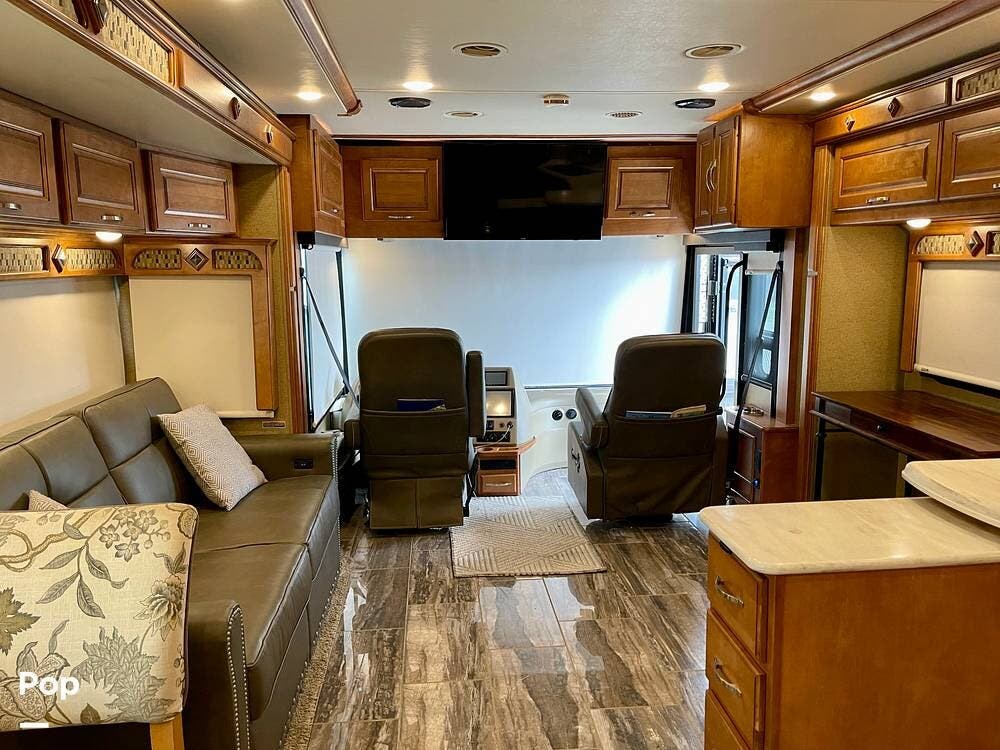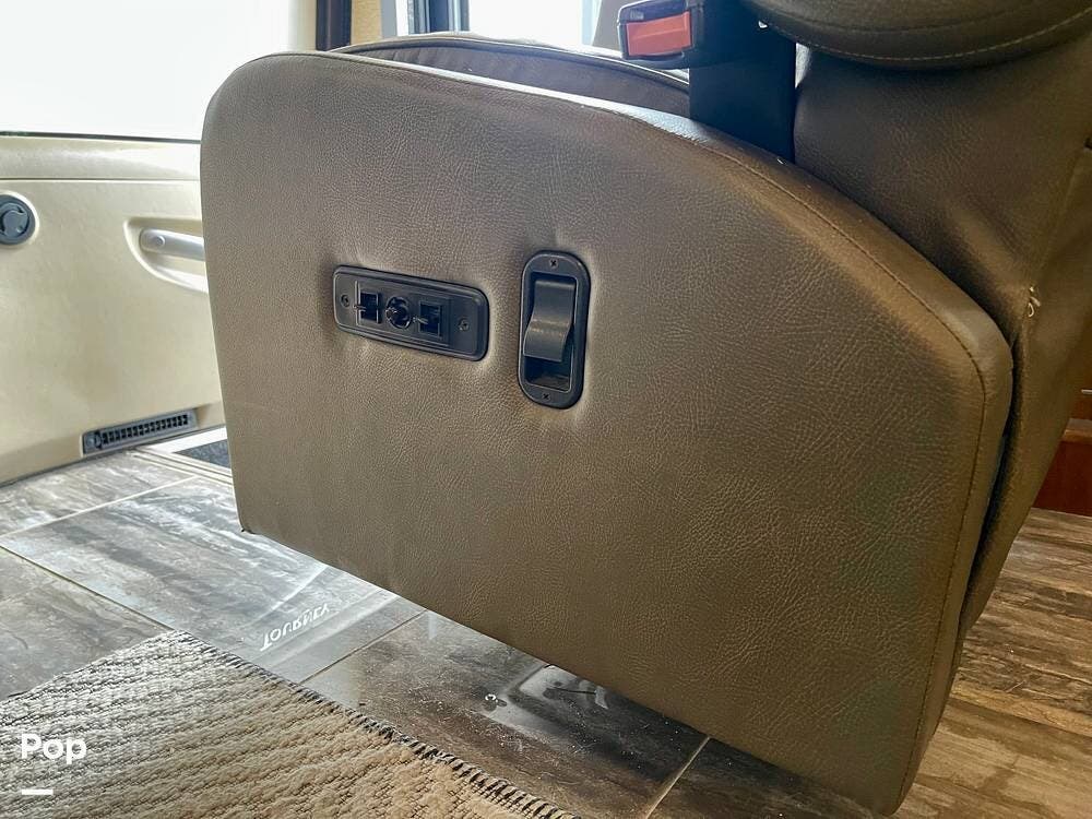 The interior features opposing living-area slide-outs that create an open, residential feel with generous seating and storage. It also features theater seating and a residential refrigerator.