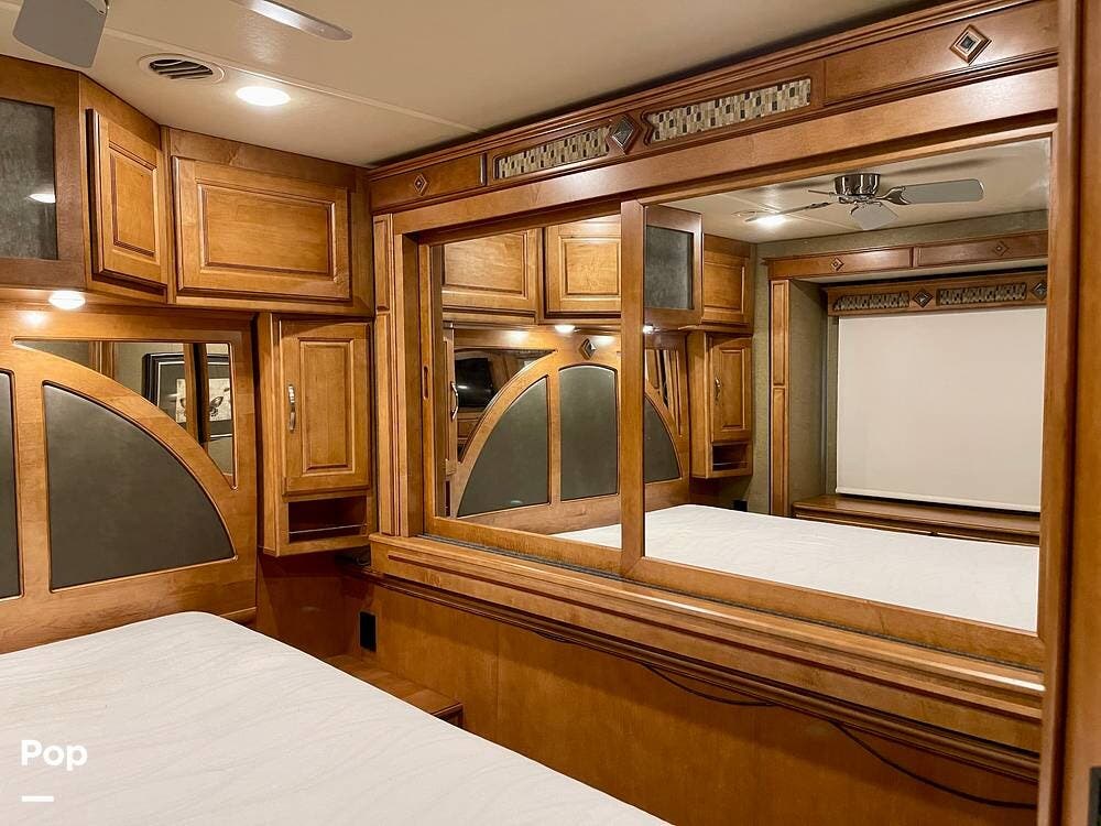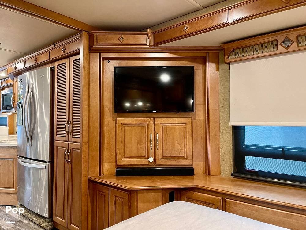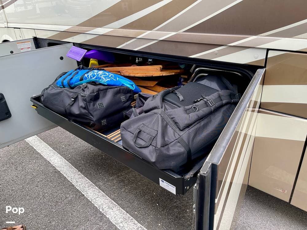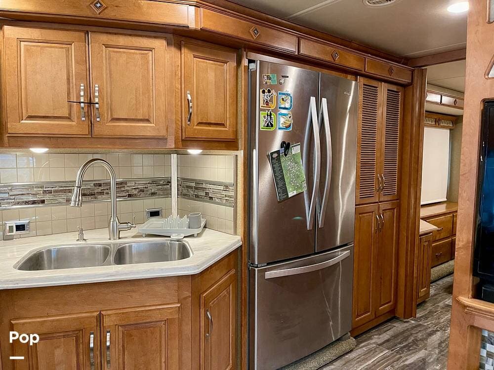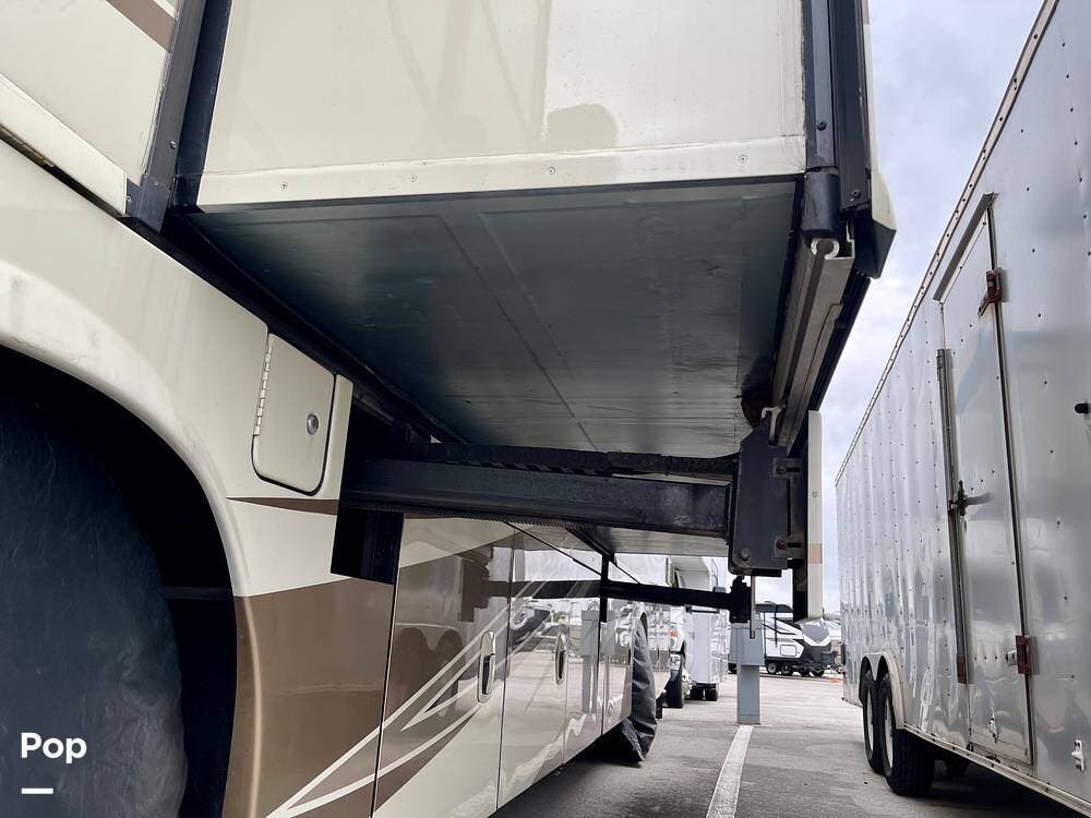 The interior features opposing living-area slide-outs that create an open, residential feel with generous seating and storage. It also features theater seating and a residential refrigerator.
