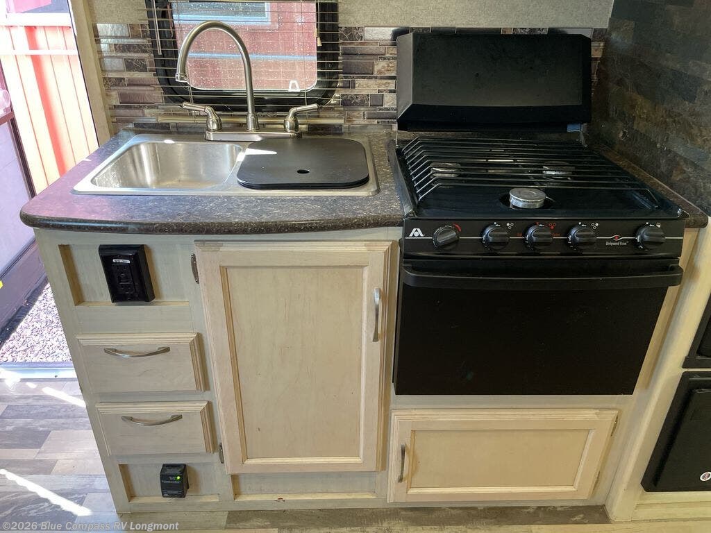 The second sofa is on a slide along the road side wall. Above the sofa there is overhead storage which helps to keep your things neat and tidy. You can enjoy meals at the sofa as there is also a table in front of it. Adjacent to the slide is a TV and pantry. On the opposite side of the trailer you can prepare your favorite meals using the two burner range and microwave oven, plus clean up easily at the double kitchen sink. You will also find a refrigerator for your perishables.