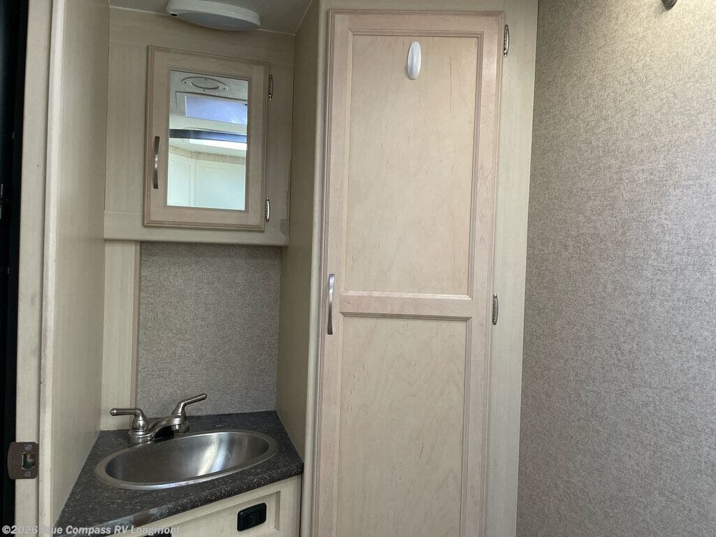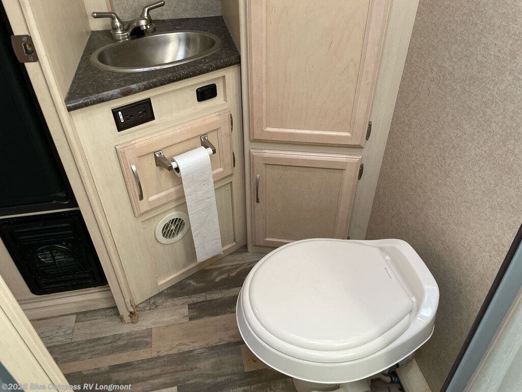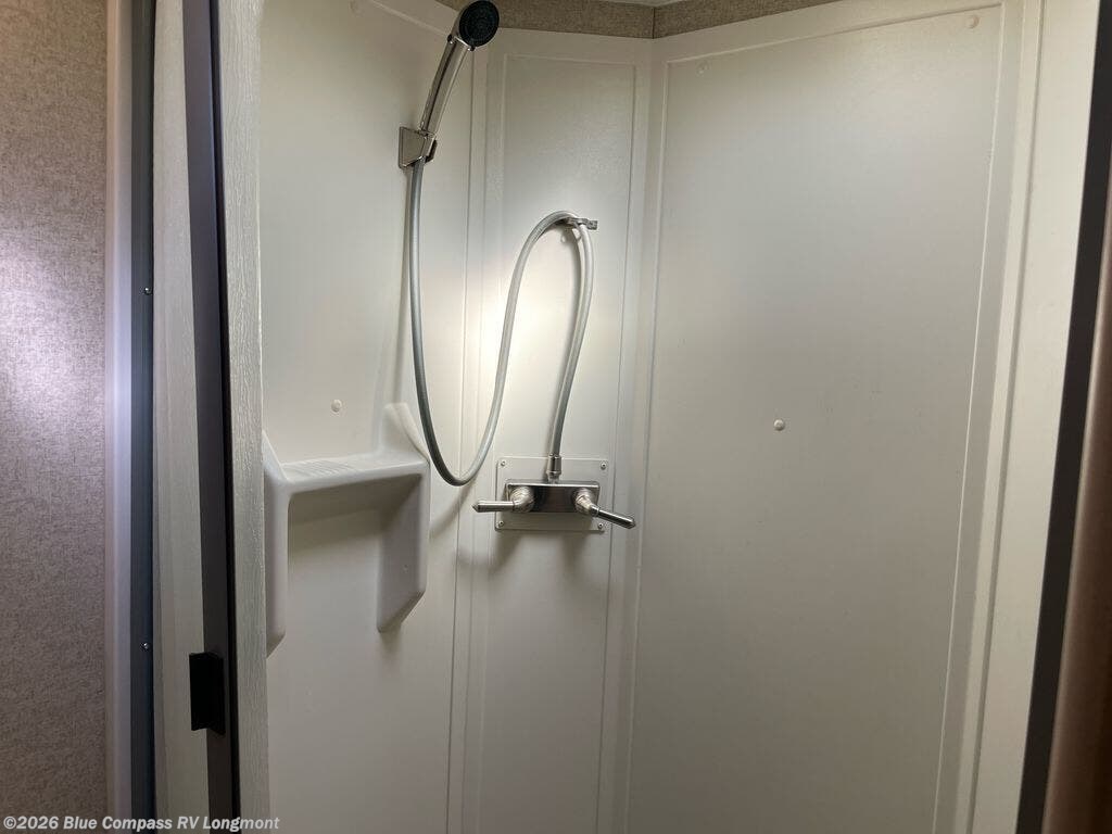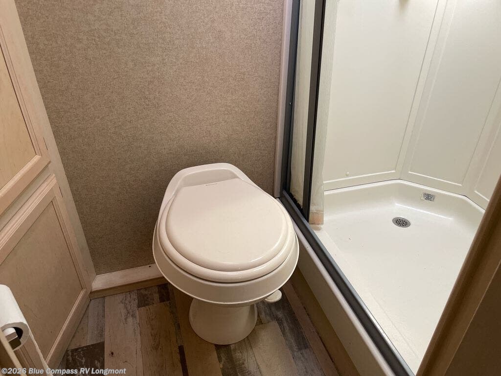 Located in the rear of the trailer is the bathroom. Inside find a shower, toilet, wardrobe, sink, and medicine cabinet, plus more!