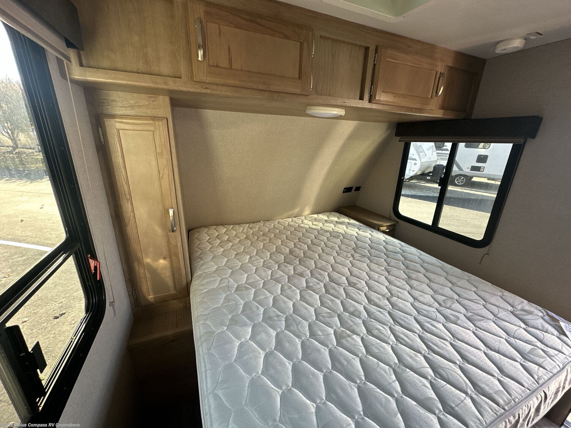 As you enter this travel trailer, along the front there is a queen bed with overhead storage. On one side of the bed there is a wardrobe, and the other side has a nightstand.
