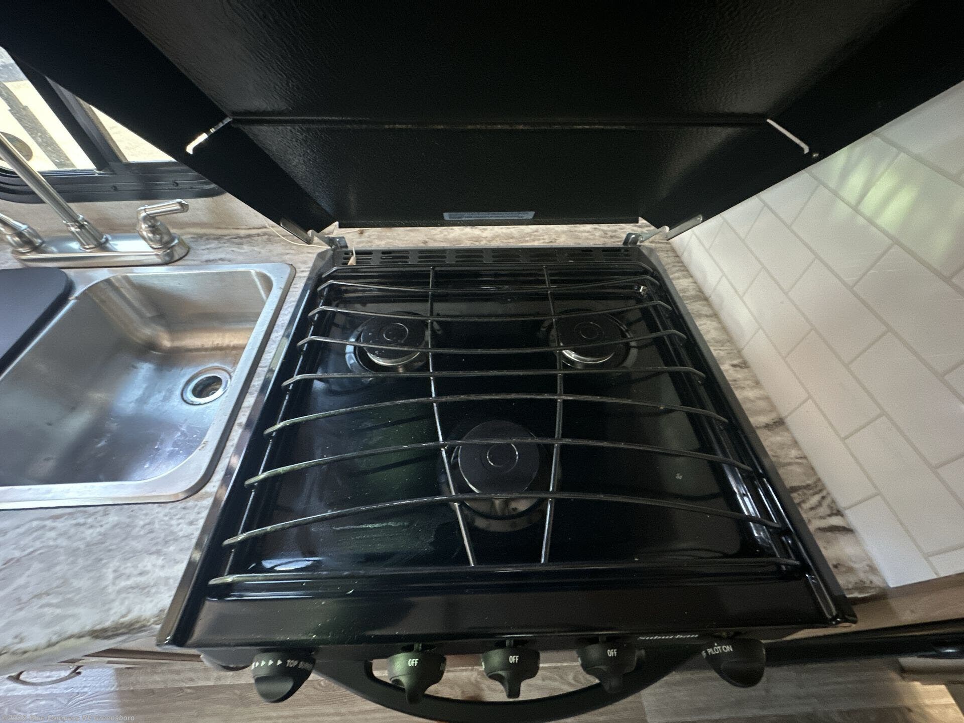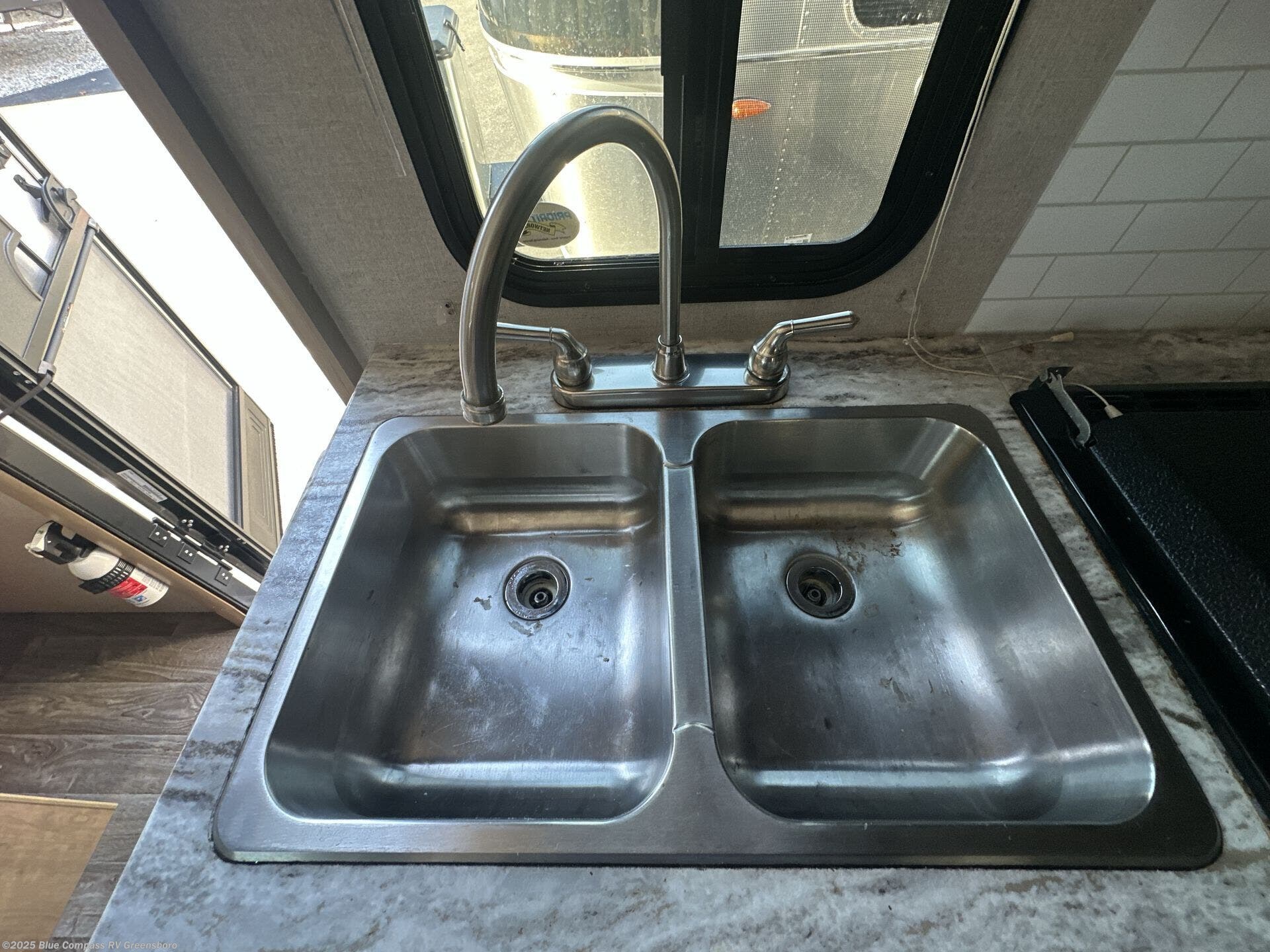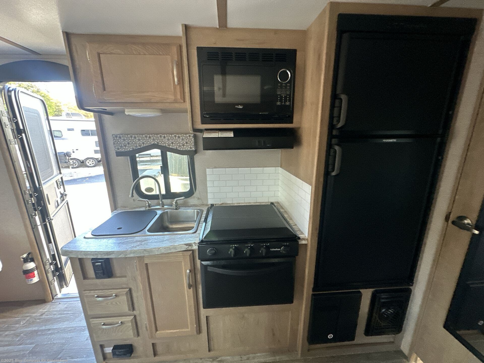The sofa is on a slide along the road side wall. Above the sofa there is overhead storage which helps to keep your things neat and tidy. You can enjoy meals at the sofa as there is also a table in front of it. Adjacent to the slide is a TV and pantry. On the opposite side of the trailer you can prepare your favorite meals using the two burner range and microwave oven, plus clean up easily at the double kitchen sink. You will also find a refrigerator for your perishables.