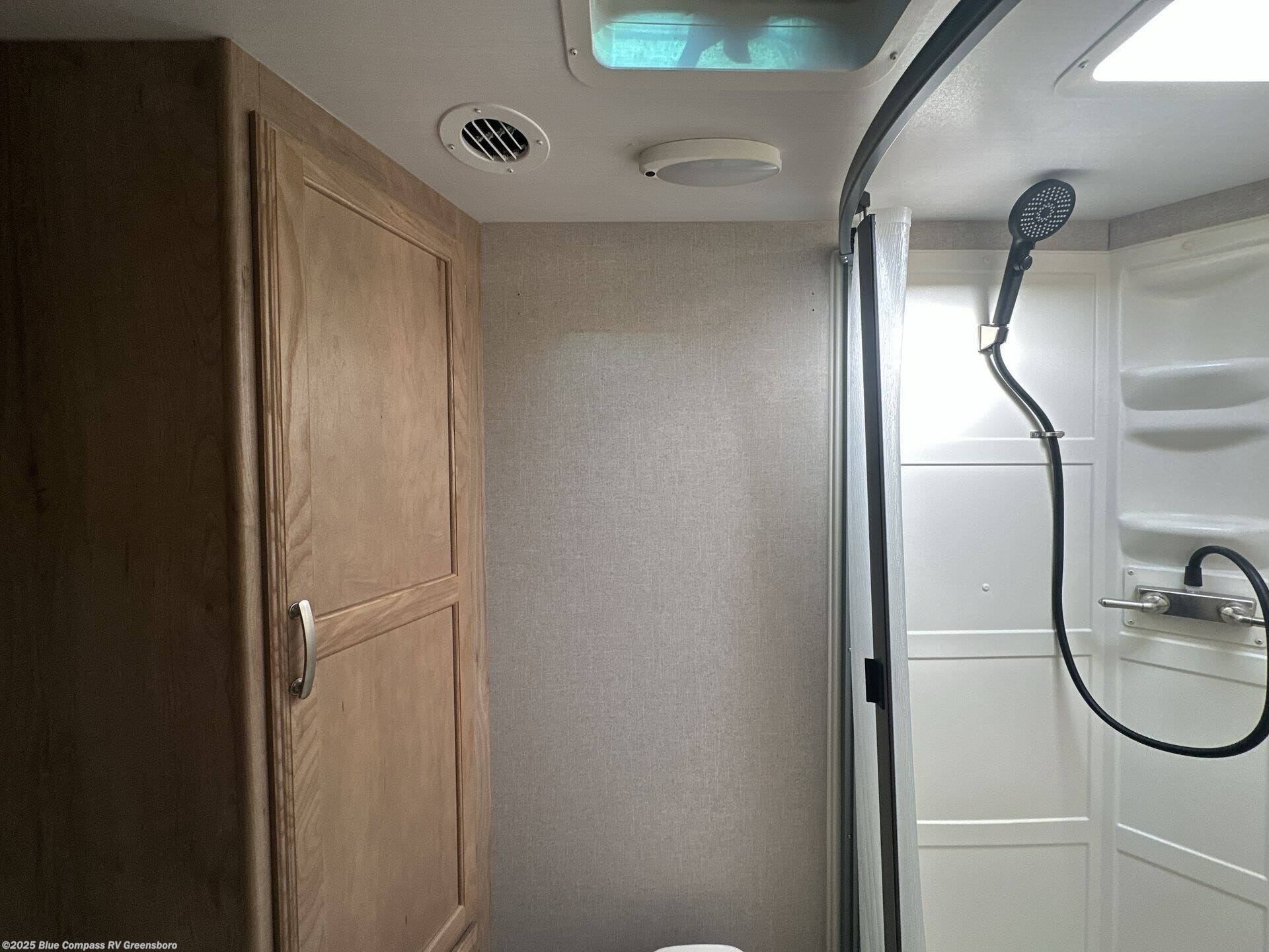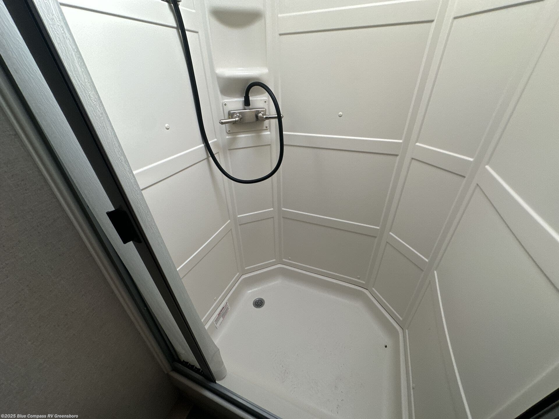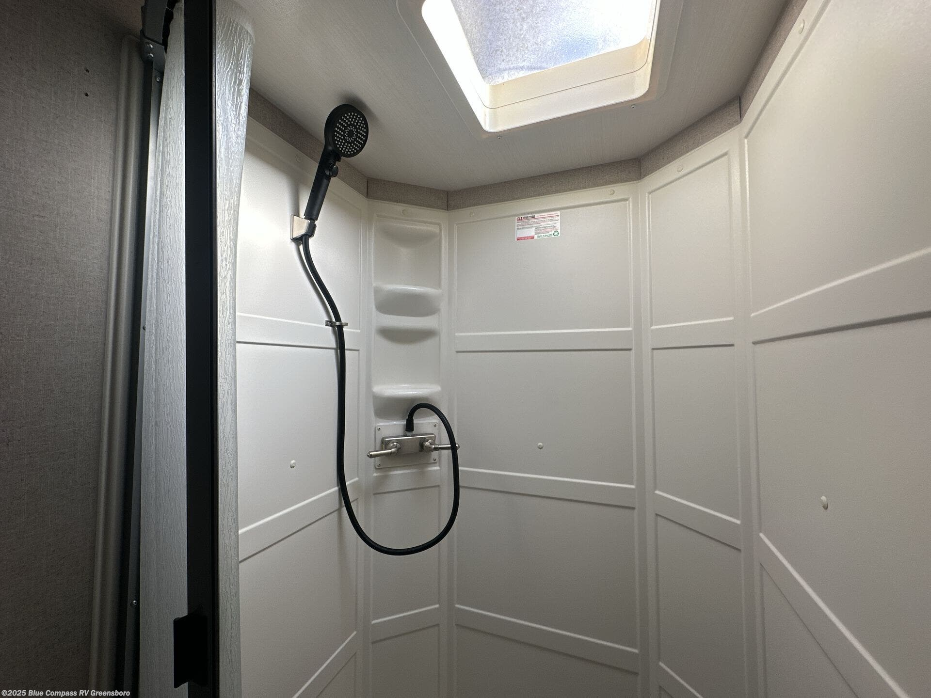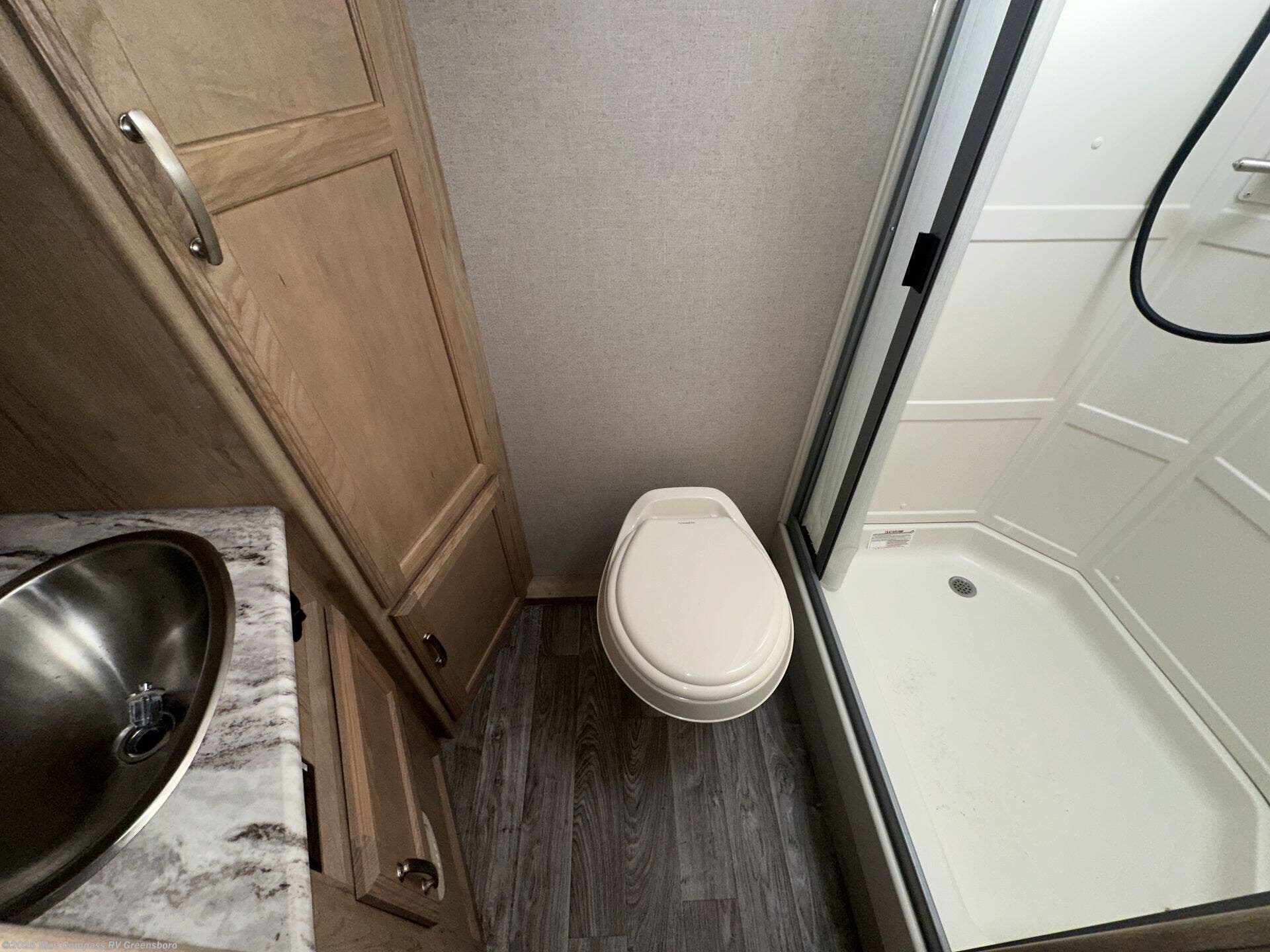 Located in the rear of the trailer is the bathroom. Inside find a shower, toilet, wardrobe, sink, and medicine cabinet, plus more!