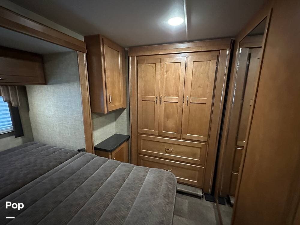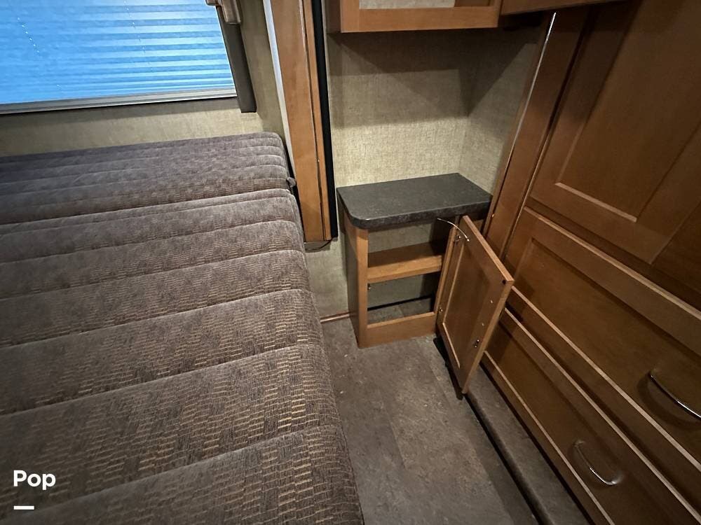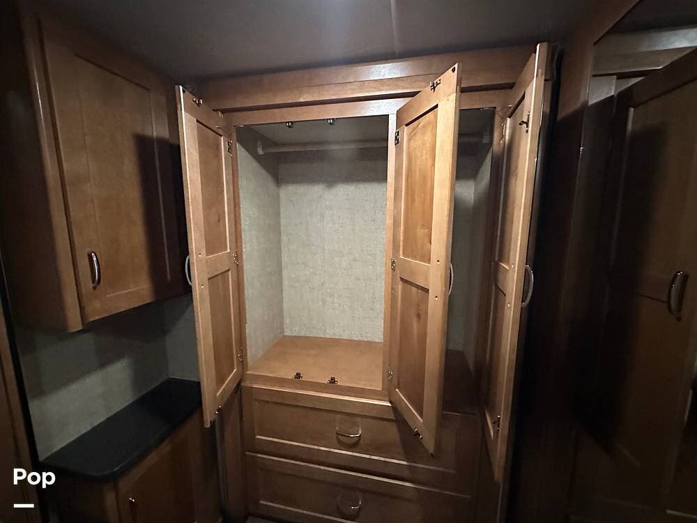 The rear private bedroom offers a queen bed slide-out, storage, a nightstand, a shirt closet, and a second slide-out wardrobe for extra space.