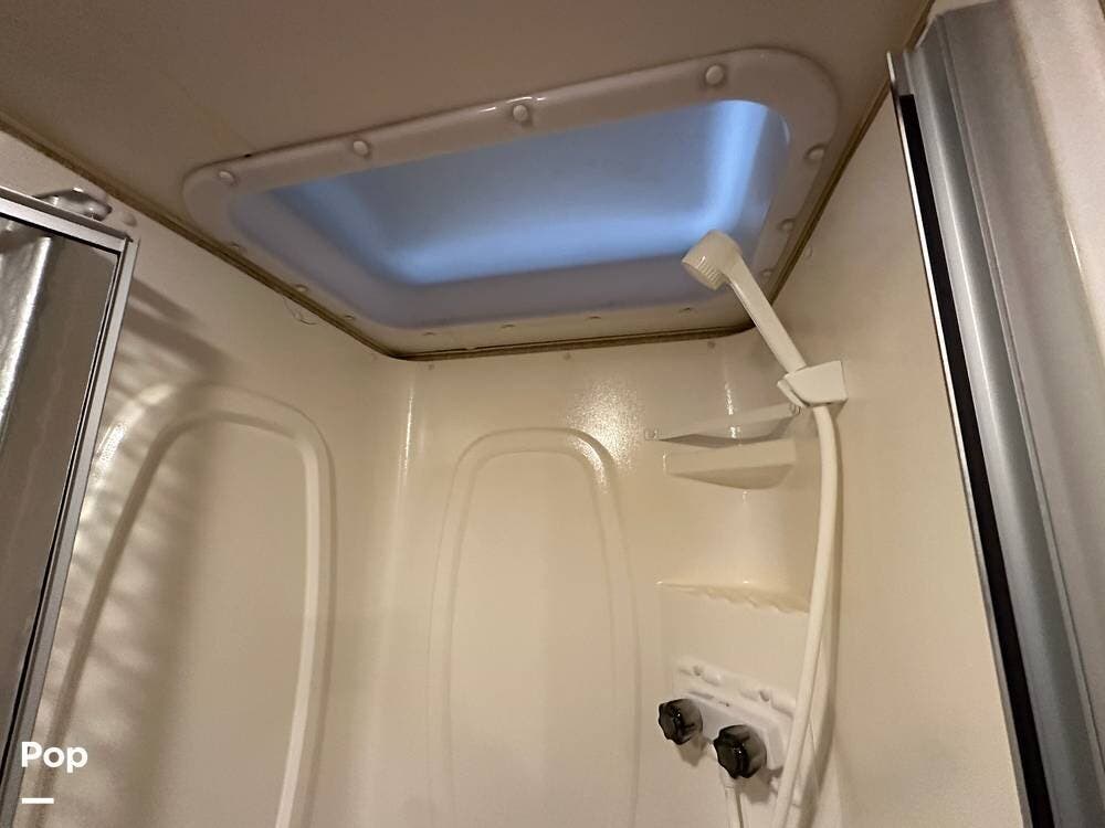 The split bathroom design includes a shower on the curbside, while the private toilet area with a vanity and sink sits on the roadside for added convenience.