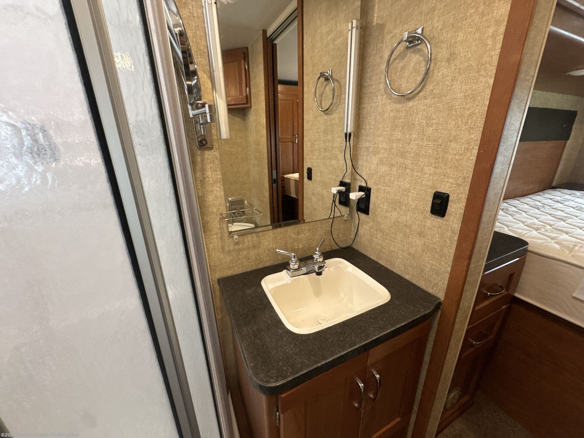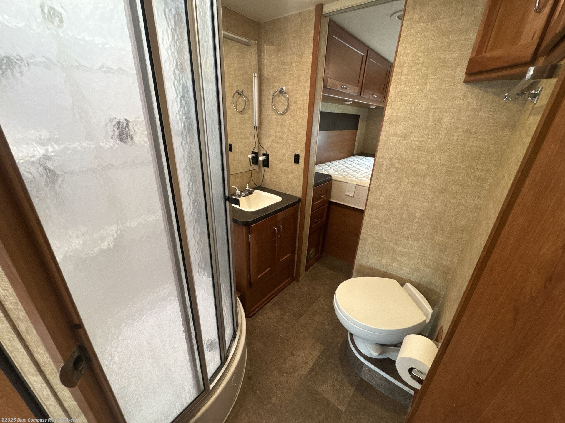 A handy full bath can be found mid-coach along the curb side. This space features a radius shower, toilet, and vanity sink, plus overhead storage.