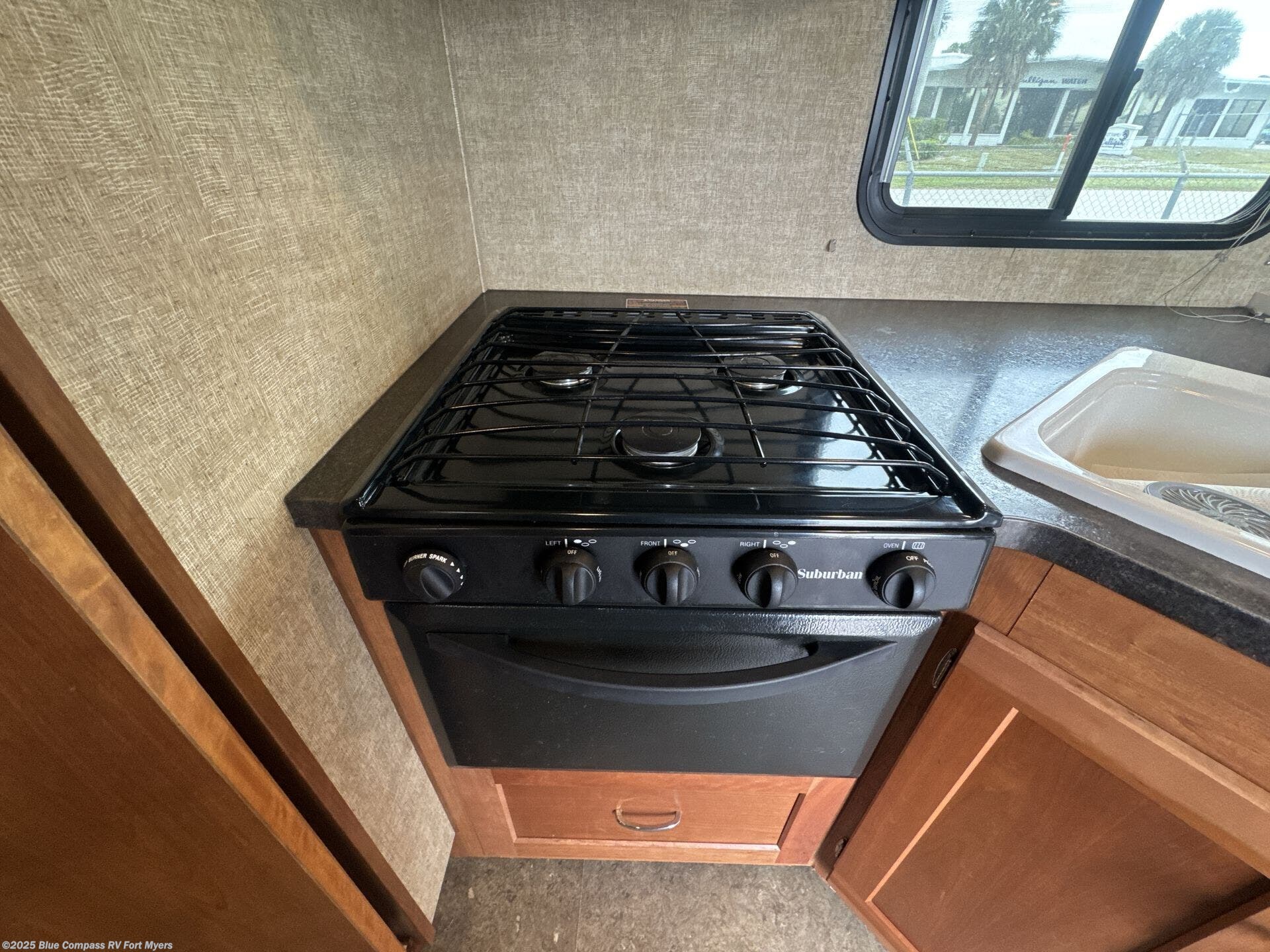 Moving toward mid-coach within the full wall slide you will find a kitchen area that offers a double sink, and a three burner range. Opposite you will find a pantry and refrigerator for all of your food storage needs. You can easily cook up light meals and snacks with the appliances provided.