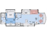 The master bath at the rear of the 36Z is outfitted with a sink with vanity, a foot-flush toilet with sprayer, a shower with skylight, cabinet and drawer space, and a ceiling exhaust fan.