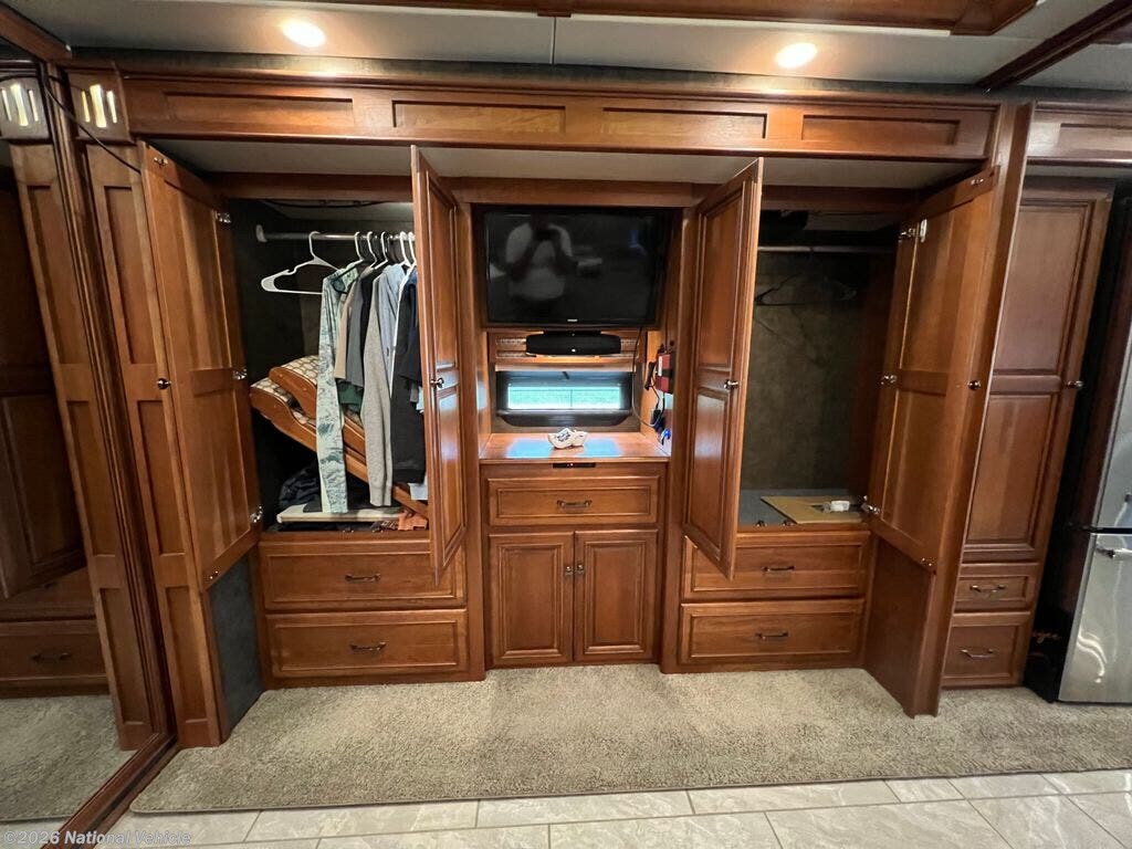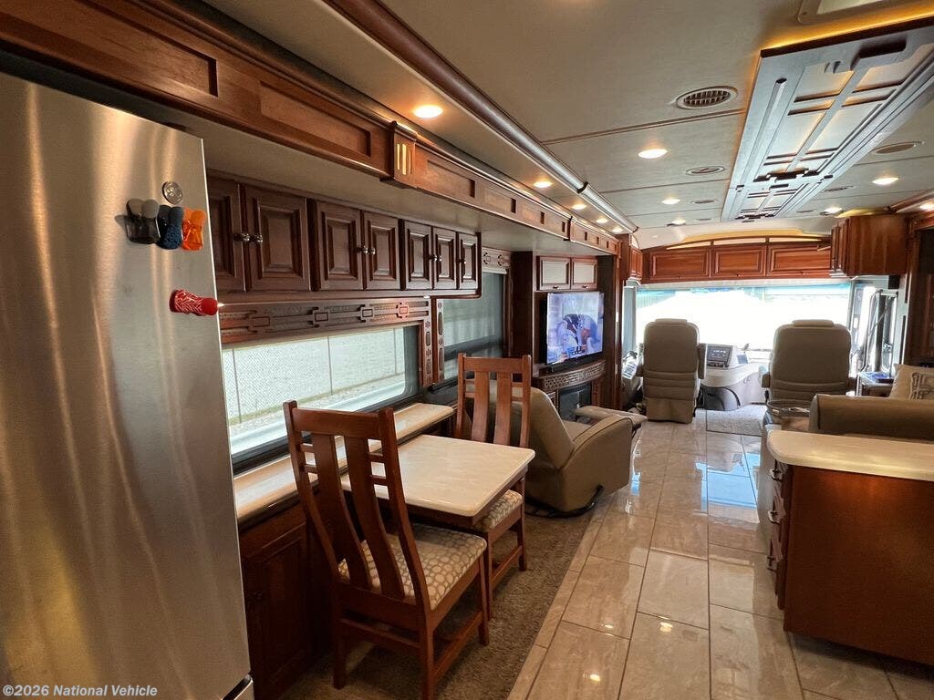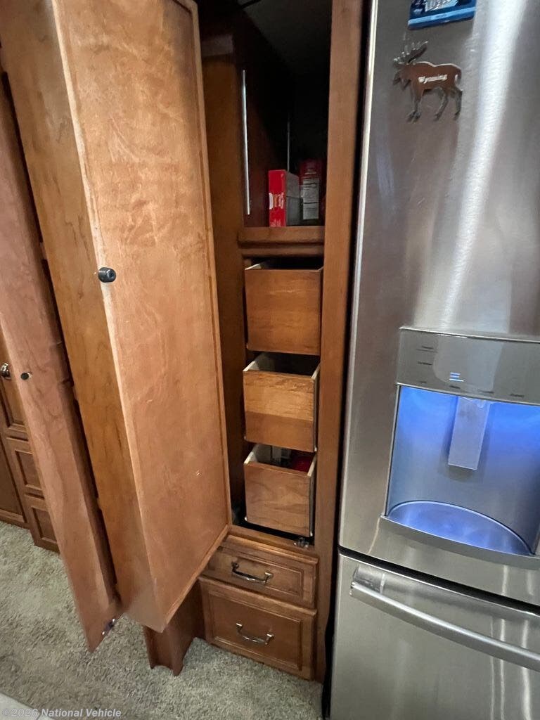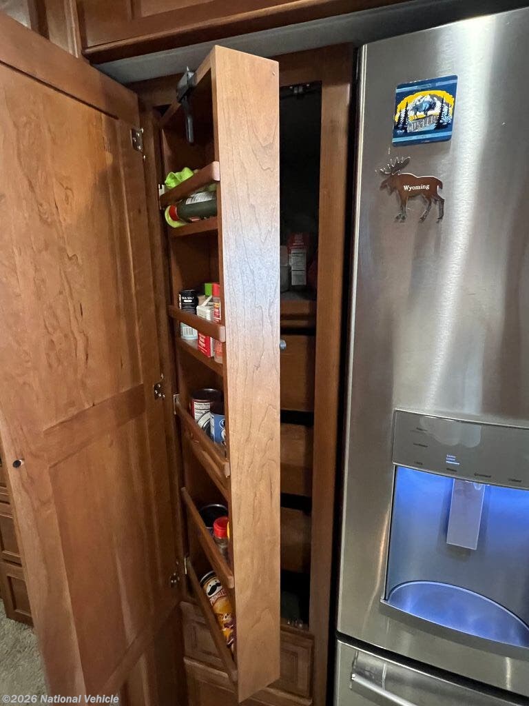 Opposite you will find an entertainment center with fireplace and 50" HDTV for enjoyment, a pull-out flip-up table and recliner. There is also an extendable Glide and Dine table with four chairs in the front portion of this full wall slide. Continuing on back there is a residential refrigerator, pantry, and bedroom wardrobes, plus a 28" HDTV.
