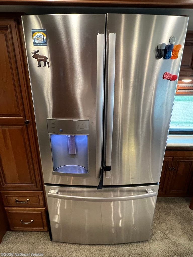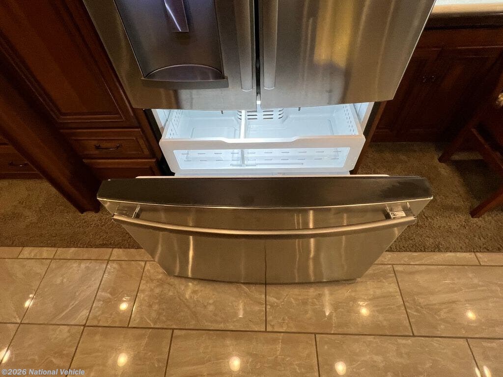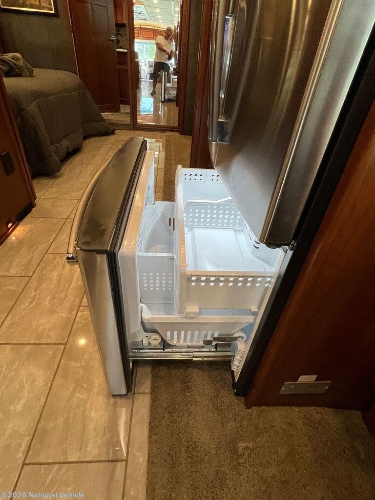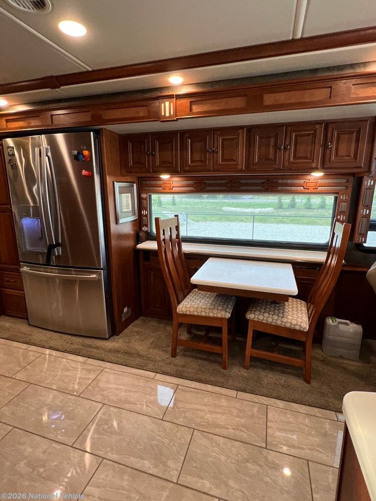 Opposite you will find an entertainment center with fireplace and 50" HDTV for enjoyment, a pull-out flip-up table and recliner. There is also an extendable Glide and Dine table with four chairs in the front portion of this full wall slide. Continuing on back there is a residential refrigerator, pantry, and bedroom wardrobes, plus a 28" HDTV.