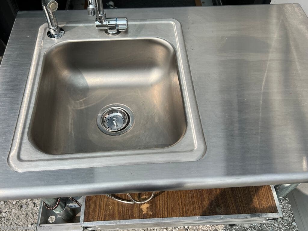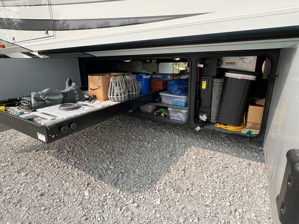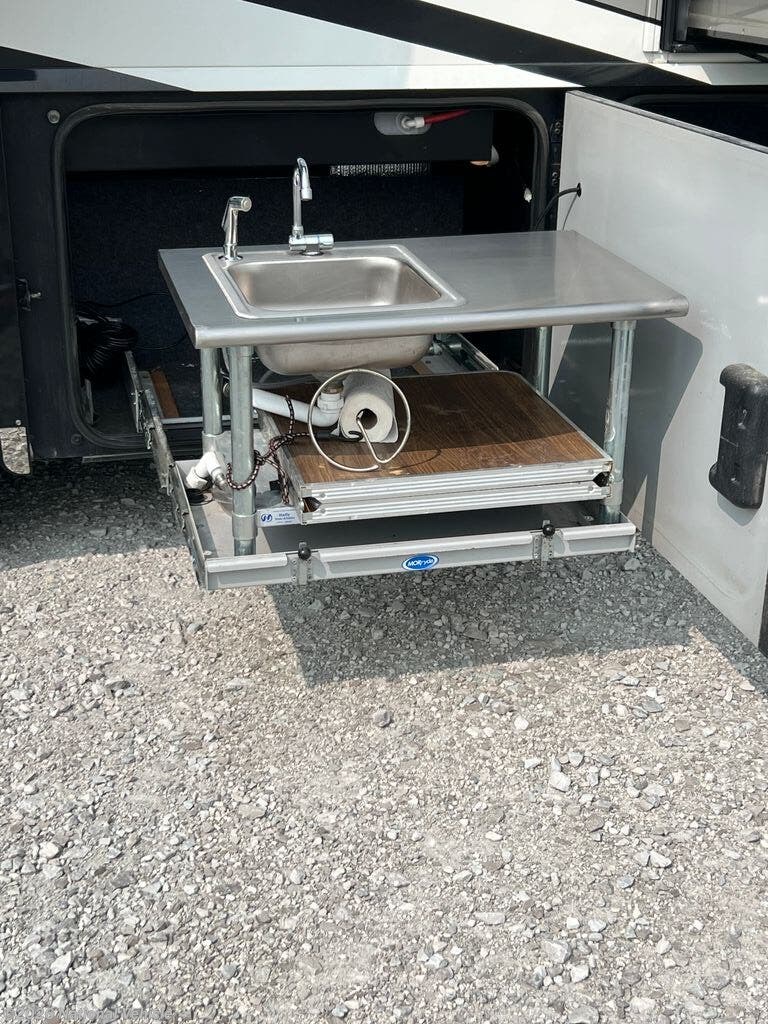 Step inside just in front of the passenger swivel seating. Looking back you will be amazed at the space you see. There is a Rest Easy extendable sectional sofa along with part of the kitchen in the slide immediately behind the passenger seat. There are overhead cabinets the entire length of the slide for organizing all of your things, including the dishes in the kitchen. There is also a pull-out island, counter space, a two burner cook-top, and double sink.
