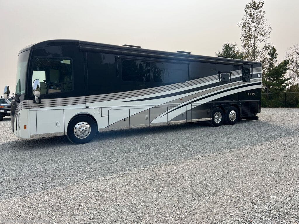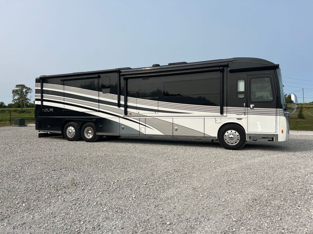 A full wall slide and one and a half baths gives this Winnebago Tour its uniqueness. With two additional slides model 42QD feels spacious and comfortable providing a great home on wheels for two or four individuals.