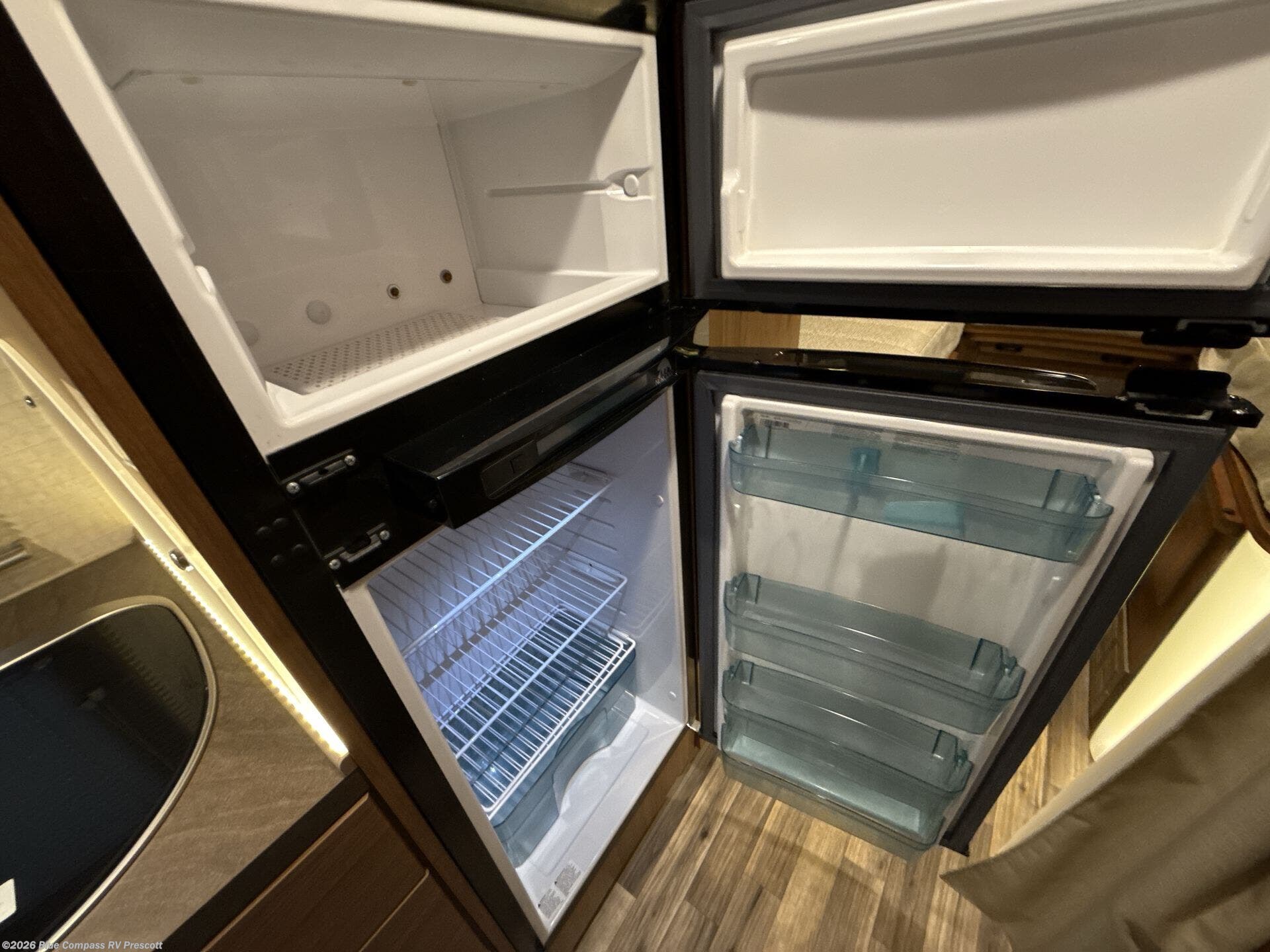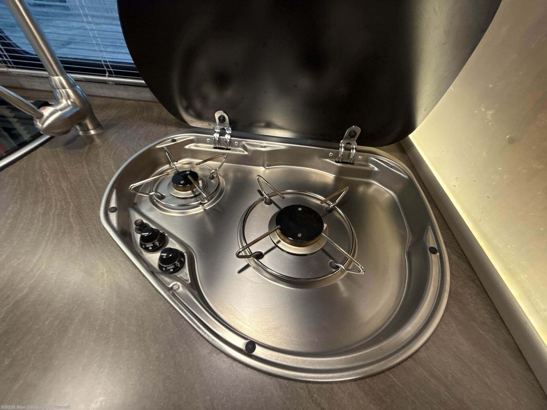 The kitchen area is to the left of the entry door and features everything you need to cook light meals and snacks while you travel. There is a kitchen sink, a two burner range top, overhead cabinets, plus a refrigerator for your perishables.