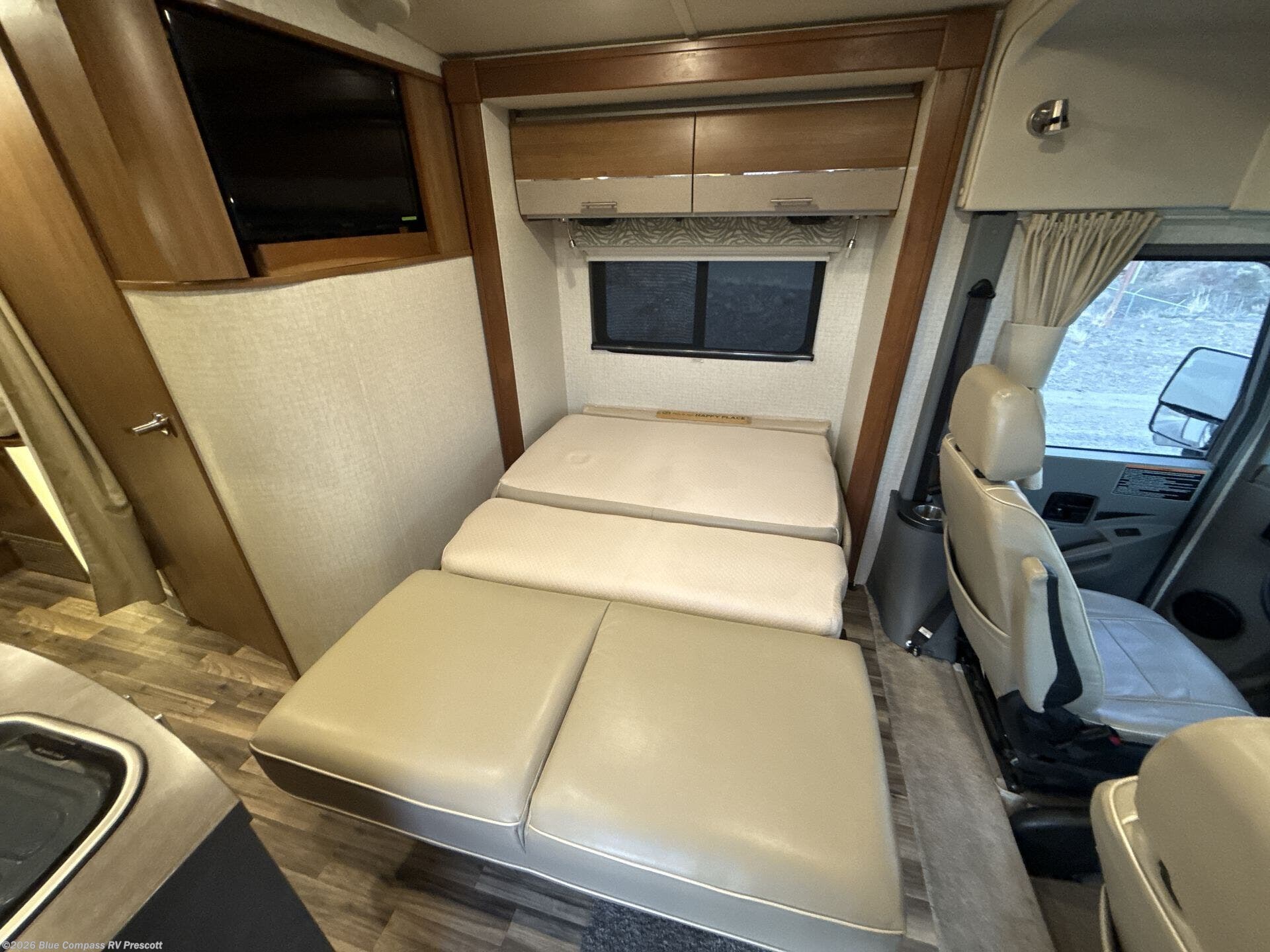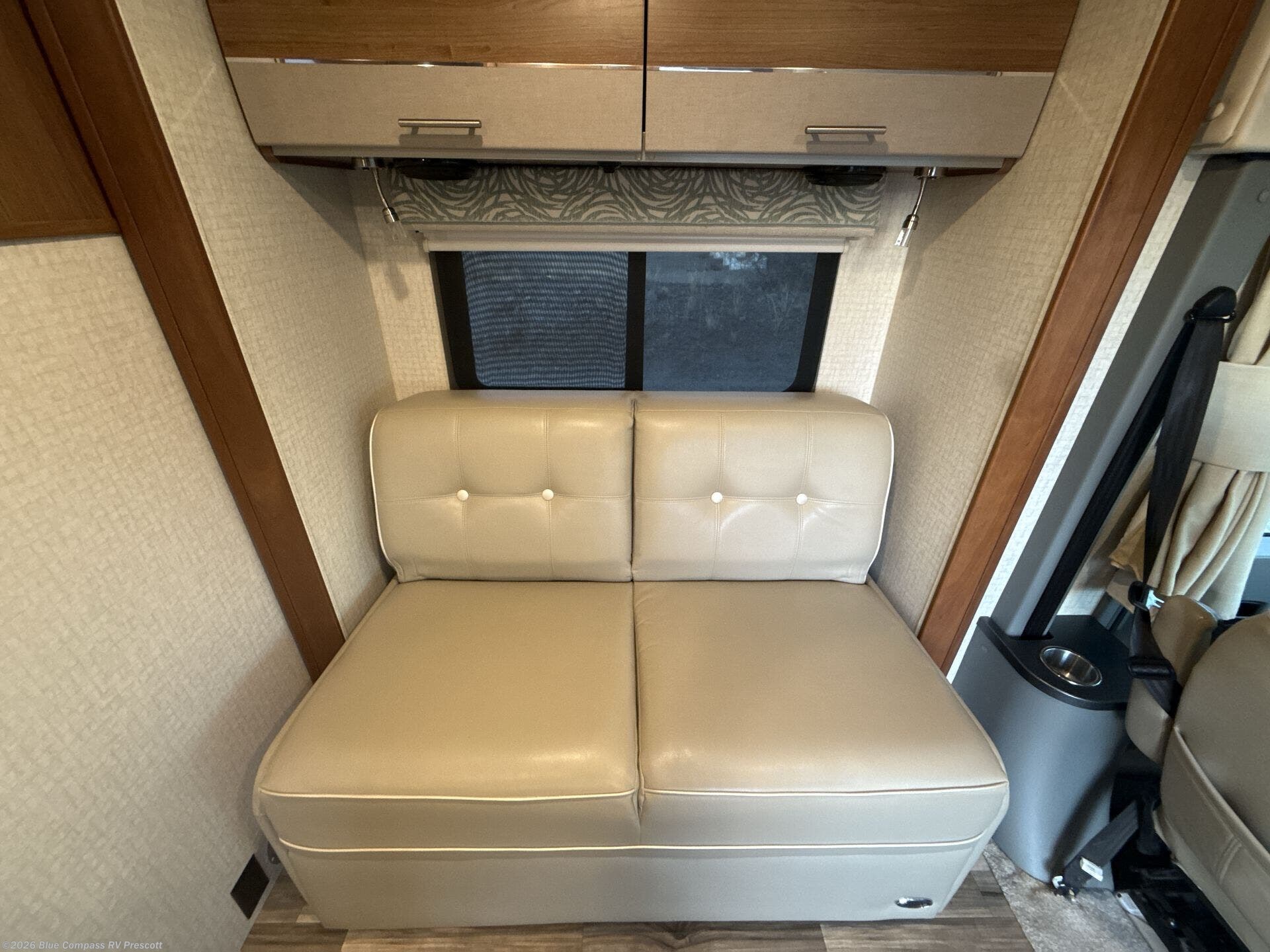 Step inside and find a Flexsteel Fold-N-Tumble slide out opposite the door. There is a movable pedestal table that is handy for dining nearby, or it can also be moved between the two cab seats when they are swiveled around. An optional StudioLoft bed that is 49" x 73" is available for additional sleeping if needed up above.