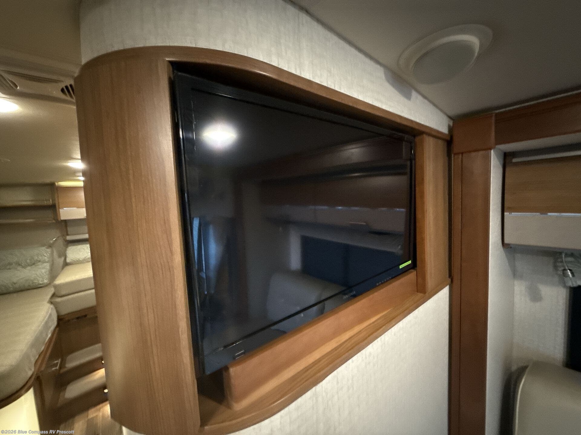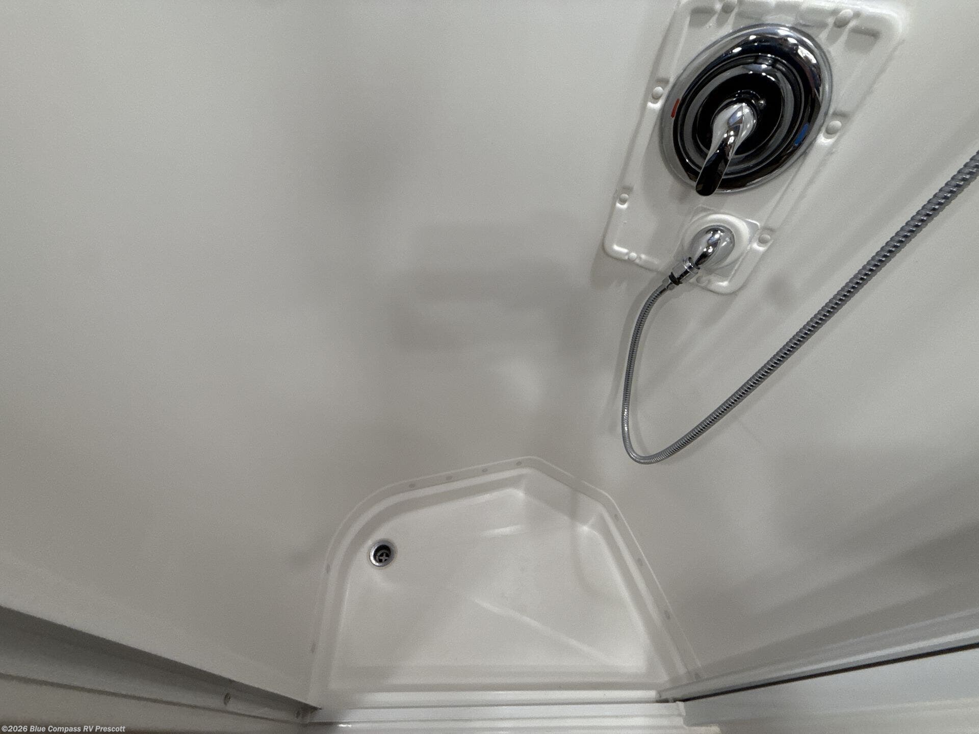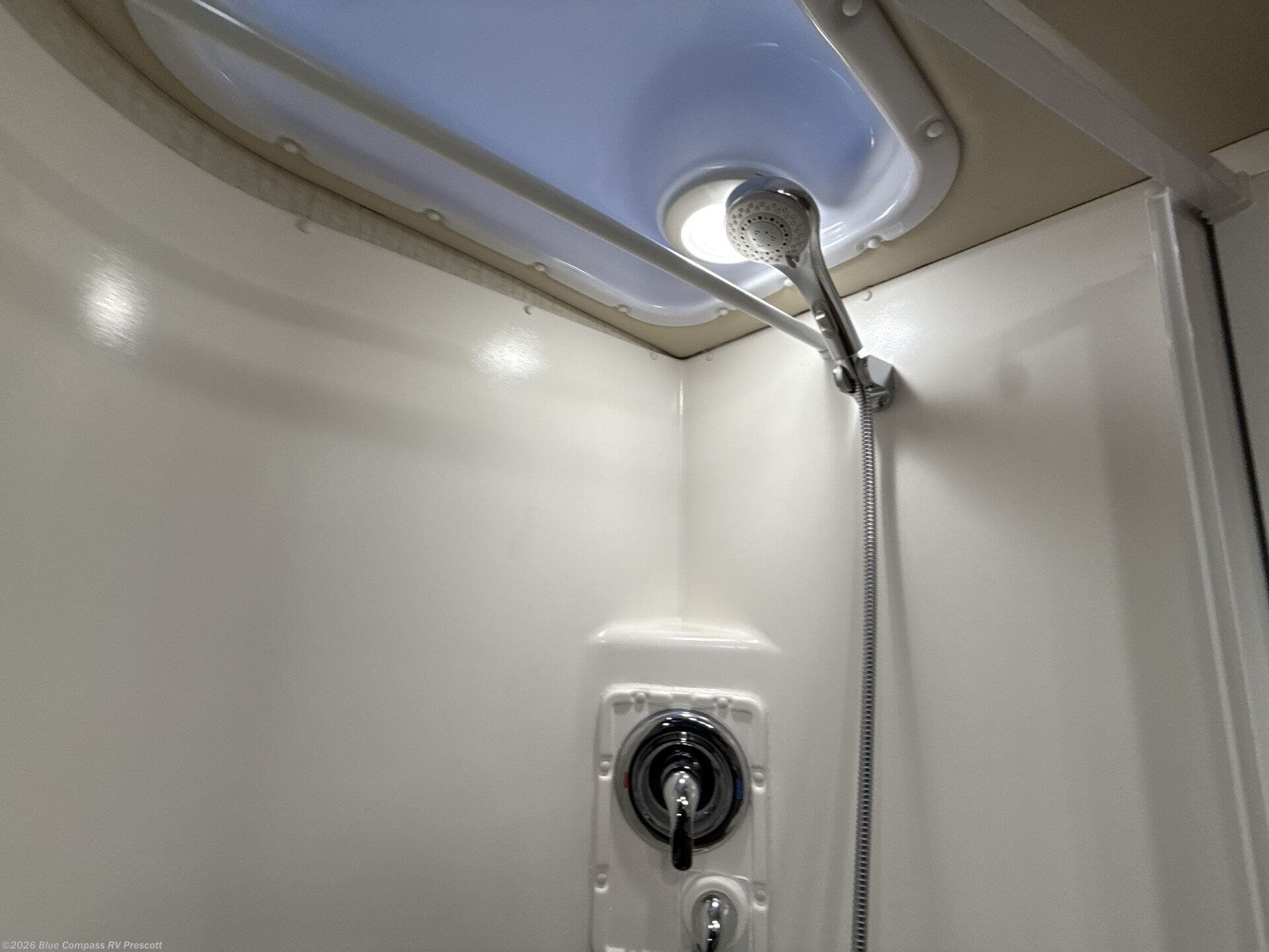 A side aisle bath is found next to the slide out seating area and features a shower, toilet, and vanity with sink, plus overhead storage. Along the outer wall of the bath find a HDTV to enjoy from any seating in the front area.