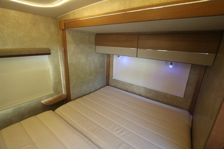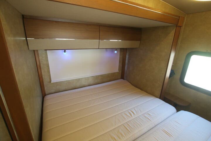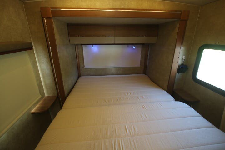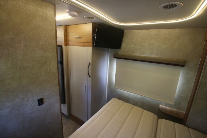 The rear bedroom in model 24G features a slide out rear queen sized bed with overhead storage cabinets for your things. There is also a spot to mount an optional flat screen 24" HDTV in the bedroom just off the foot of the bed along the wall.