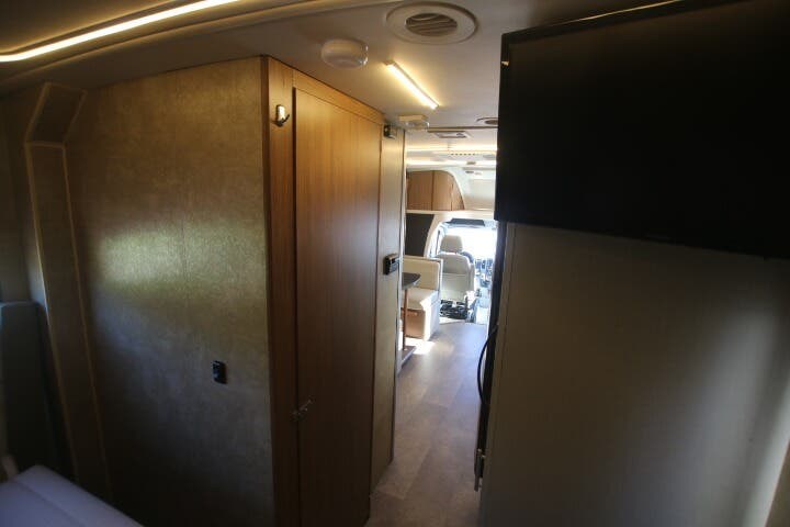 Beyond the dinette and heading toward the rear of the coach you will find a side aisle bath with a shower, toilet, and a unique swivel sink. A nice size wardrobe is found just around the corner from the bath along the curb side wall next to the refrigerator before you step into the bedroom floor area.