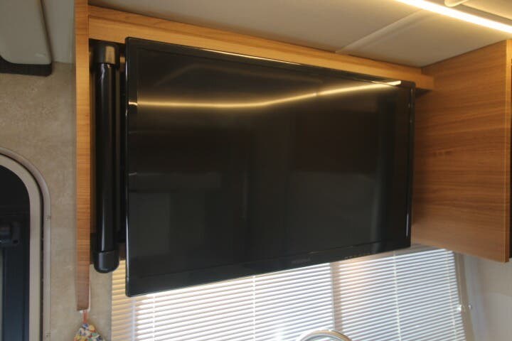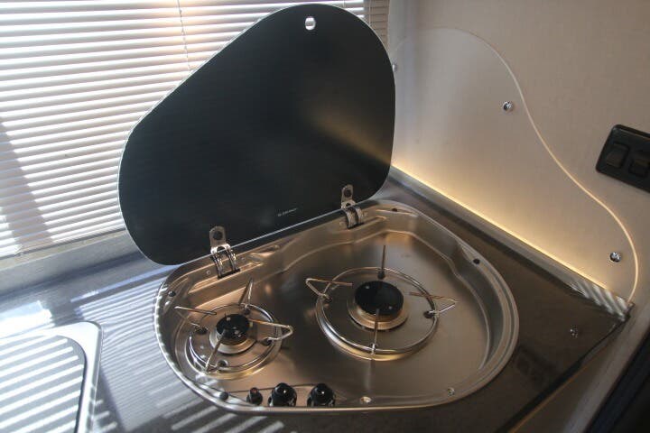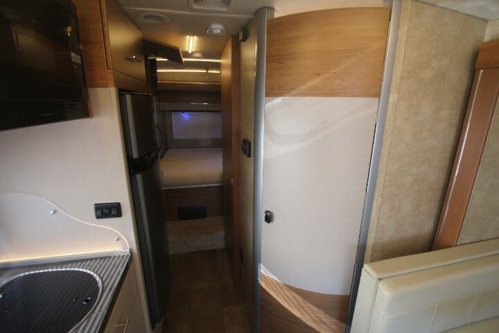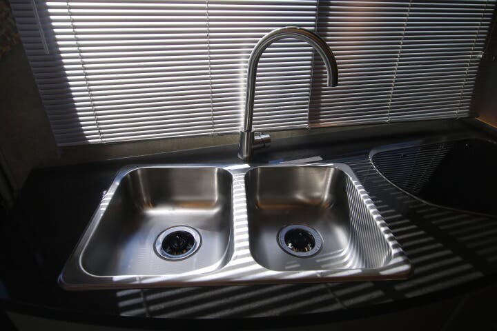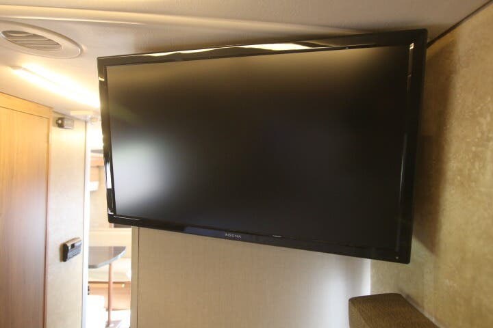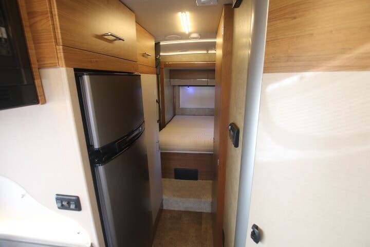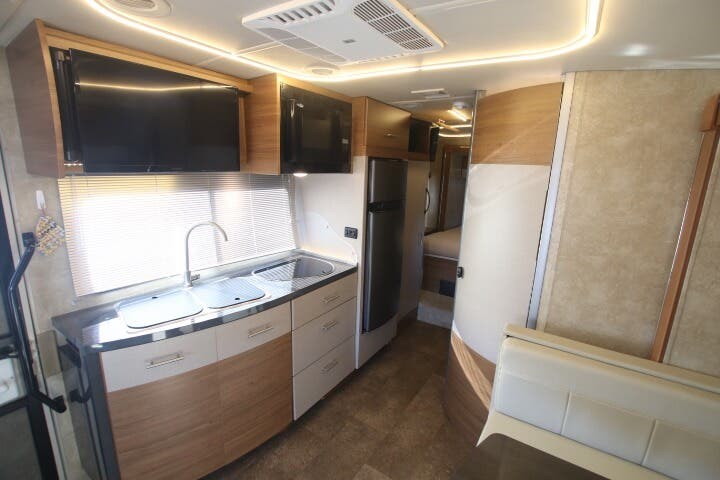 The kitchen area is to the left of the entry door and features a double sink, a two burner cook-top, and refrigerator. You will also find plenty of overhead cabinets for storage too. Above the sink area is where you will find a 28" HDTV for viewing when seated at the dinette opposite.