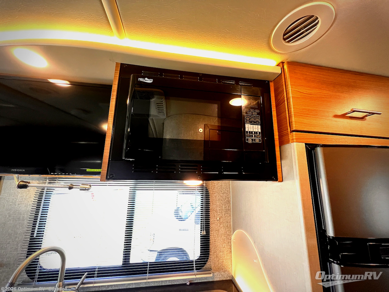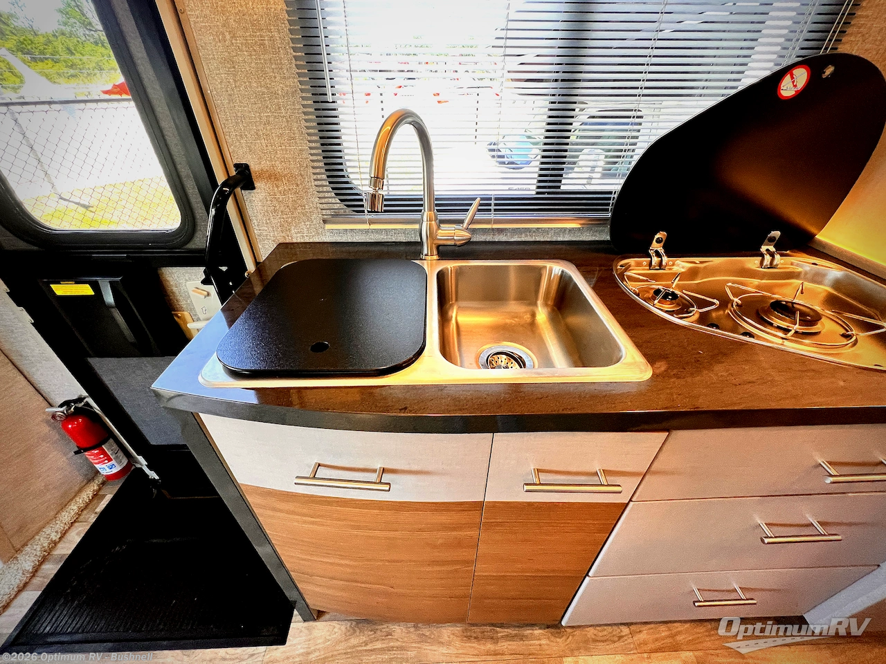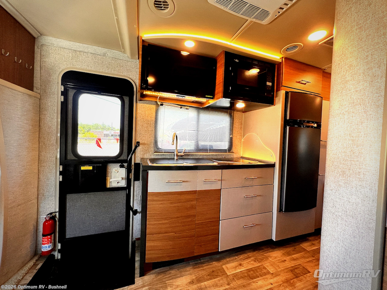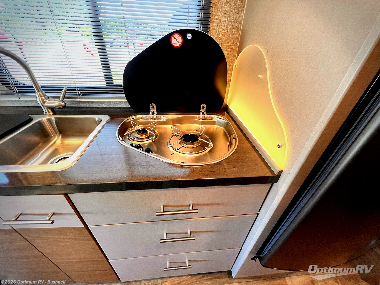 The kitchen area is to the left of the entry door and features a double sink, a two burner cook-top, and refrigerator. You will find a 28" HDTV mounted above the sink location.