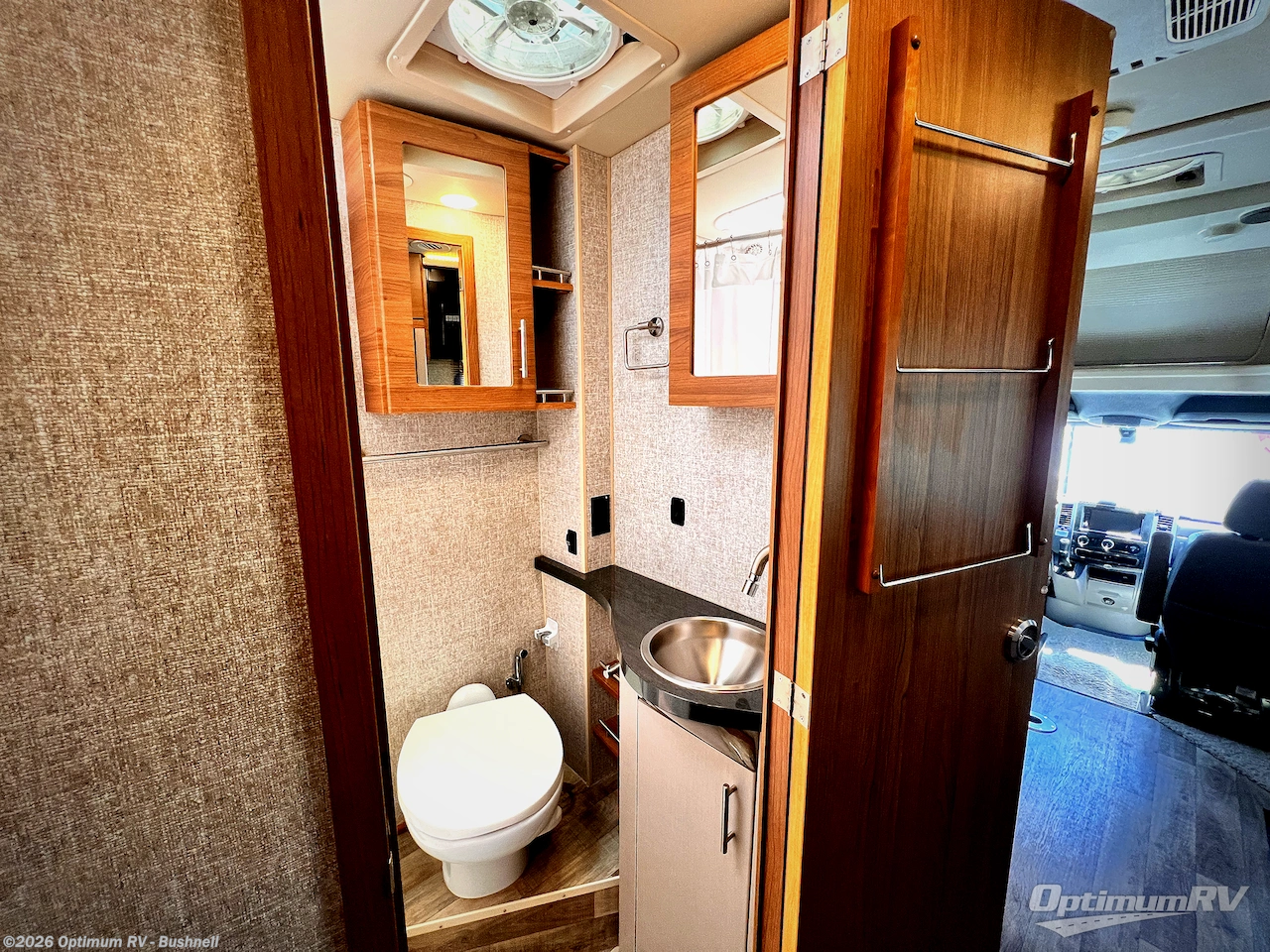 Beyond the sofa heading toward the rear of the coach you will find a side bath with corner shower, toilet, and vanity with round sink including a medicine cabinet overhead. A nice size wardrobe is found across from the bath before the rear sleeping area along the curb side wall.