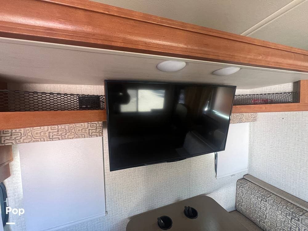 The bedroom is in the back and offers a King-size bed, overhead cabinets, a TV, and under-bed storage.
