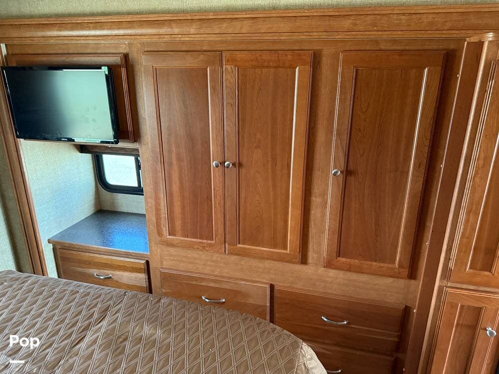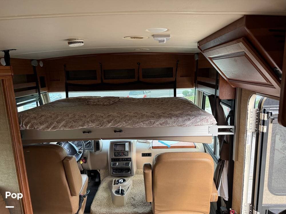 There is sleeping for six! The master bedroom has a queen bed, the dinette folds into a full-size bed, and there is a drop-down bed above the pilot and co-pilot chairs that lowers and raises with the push of a button!
