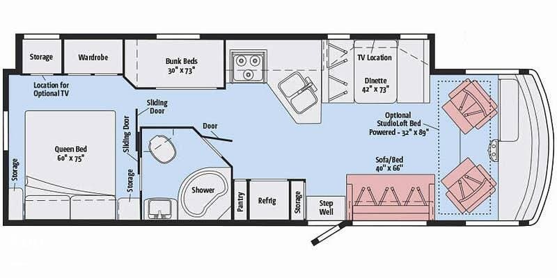 It can comfortably sleep up to 8 people with an over-the-cab drop-down bed, a dinette table, and a sofa that can convert to beds. There are also adult-size bunk beds, and the master bedroom has a queen bed.