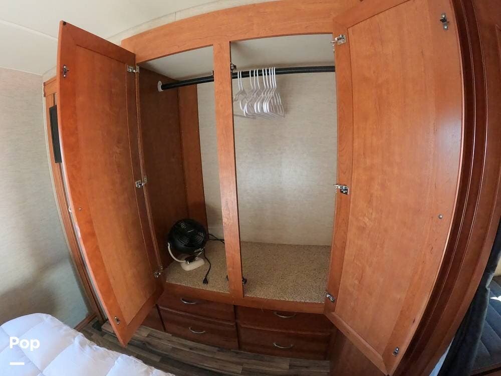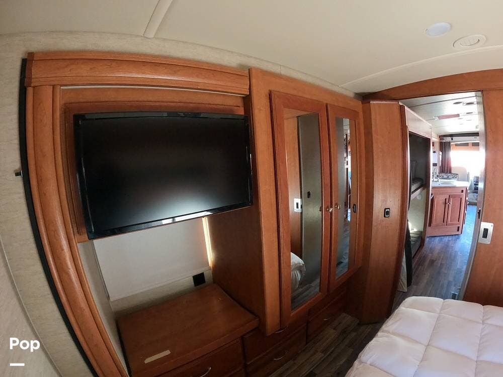 The bedroom in the back has a queen-size bed, a closet, a desk, and extra storage for clothes and personal items. A TV in the bedroom adds a nice touch for winding down.
