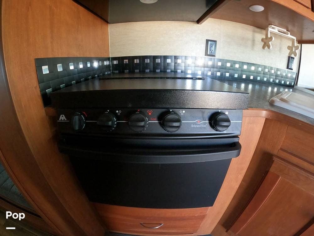 The kitchen has everything needed to cook on the road, like a stove, oven, microwave, and a good-sized fridge. There's also plenty of counter space and storage for food and supplies and a pull-out pantry.