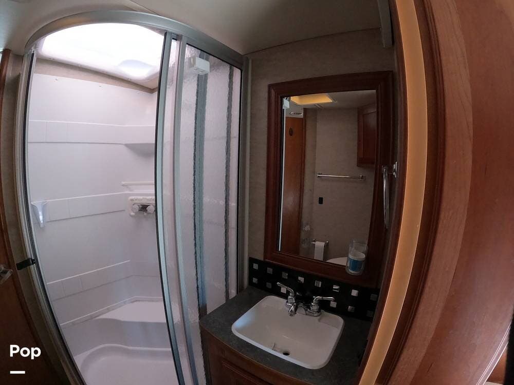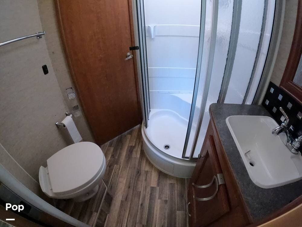 The bathroom is compact but has all the essentials, including a shower, sink, and toilet, making it easy to freshen up during trips.