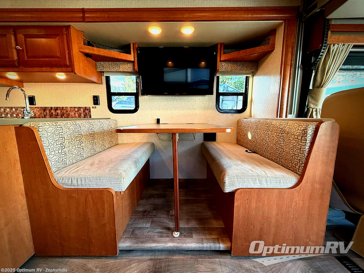 Step inside along the curb side of the coach and find a sofa/bed to your right that includes seat belts for safe traveling. There is an optional StudioLoft bed above the cab area that you can add giving you an additional 48" x 80" sleeping space for one. Across from the sofa/bed you will find added seating for meals at the 42" x 73" dinette with overhead cabinets above including a location for a 39" HDTV to enjoy. This too can become sleeping space at night when needed with the table folded down.