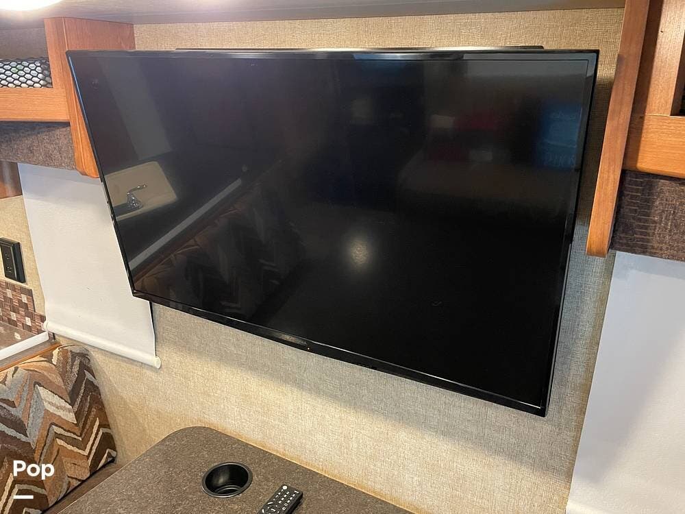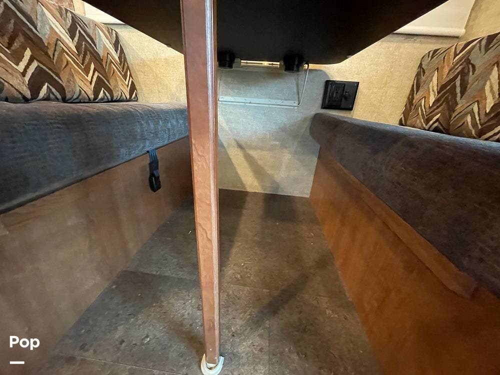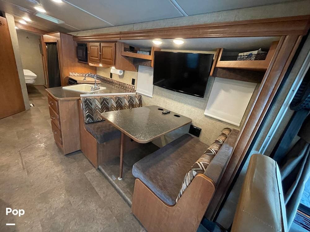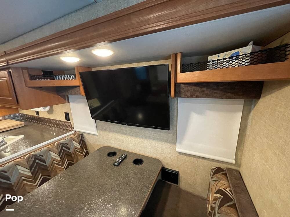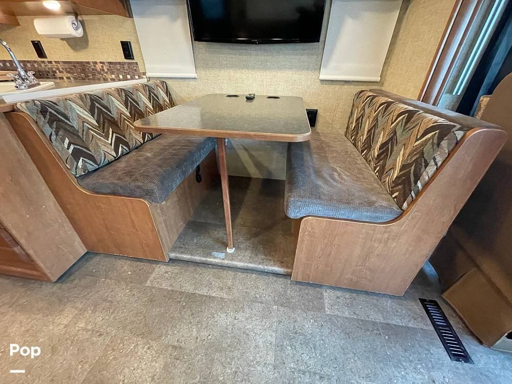 The dinette seats up to 6 and features storage under the seat benches. A flat-screen TV is mounted above the dinette table for viewing from within the living space.