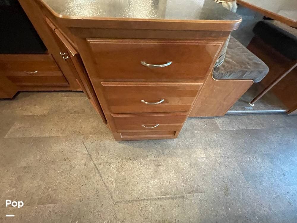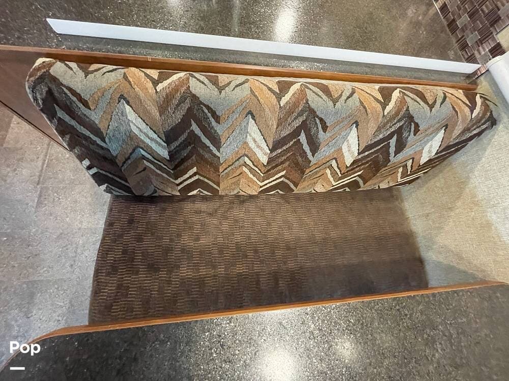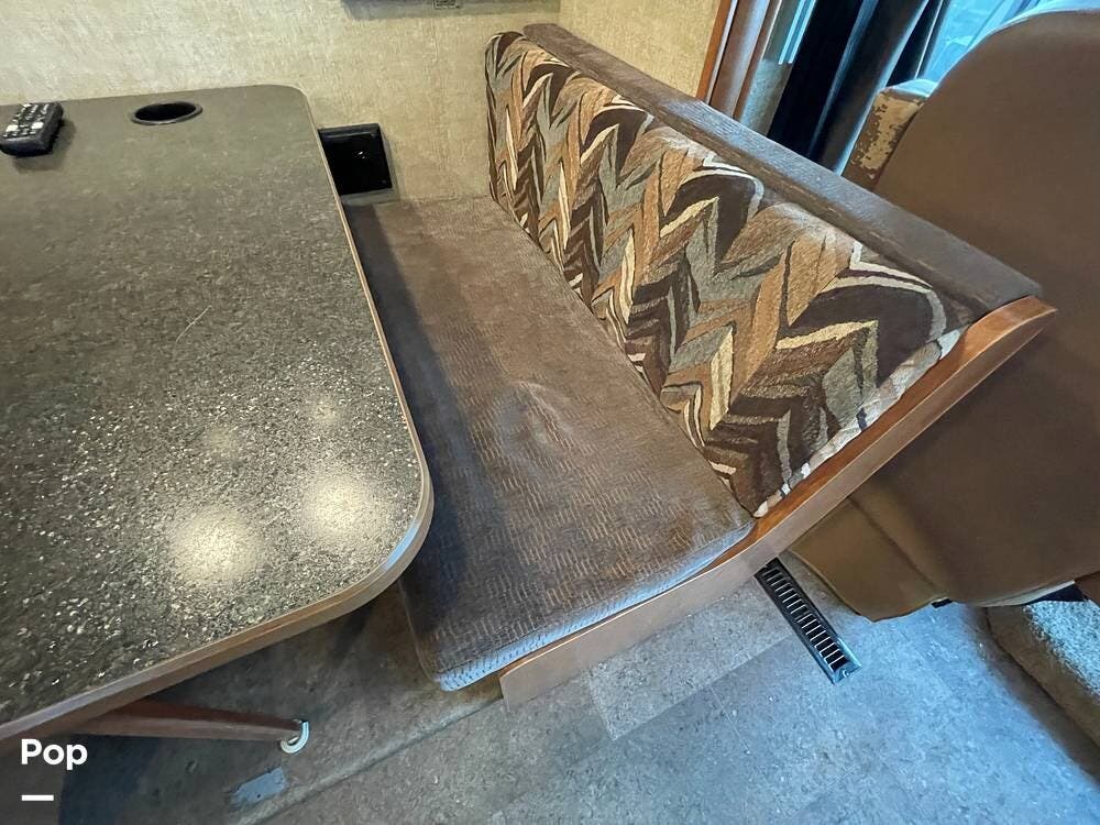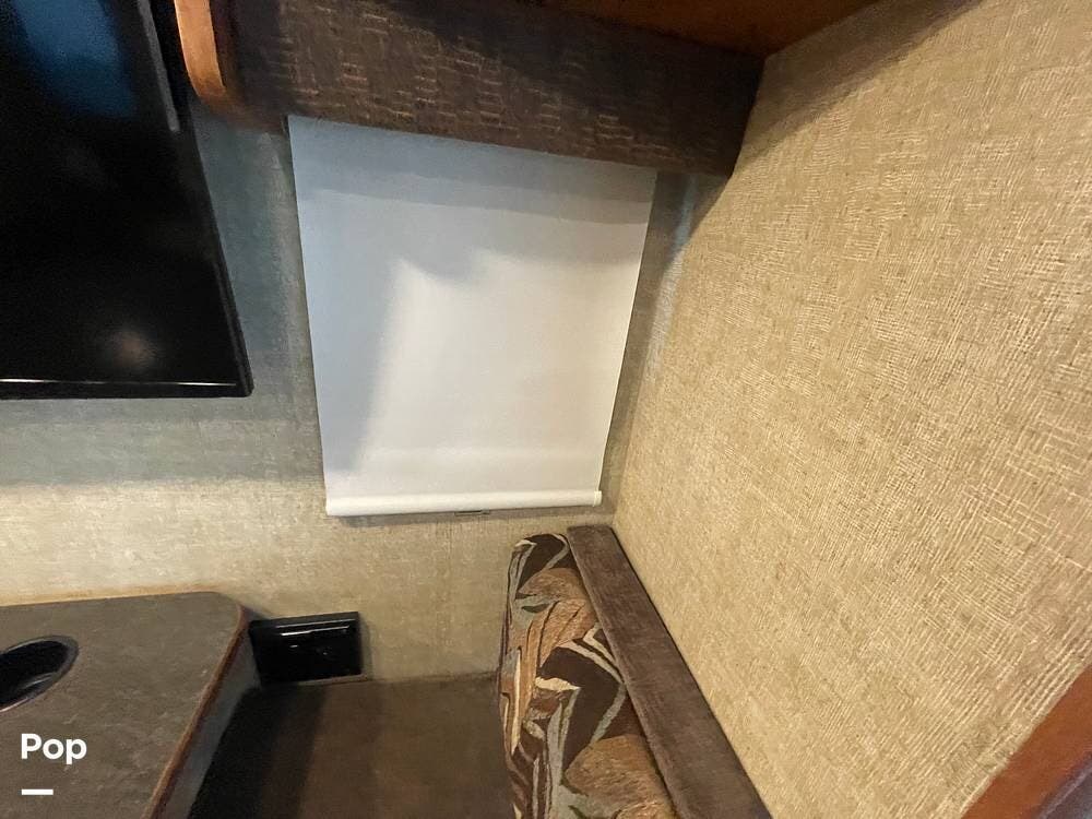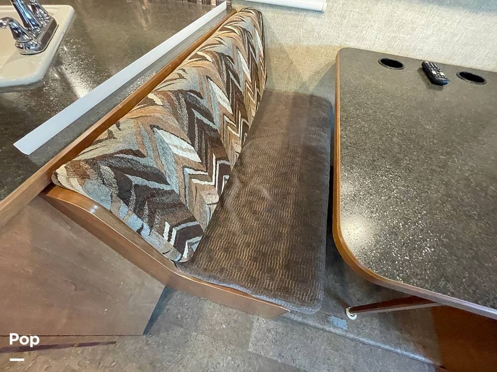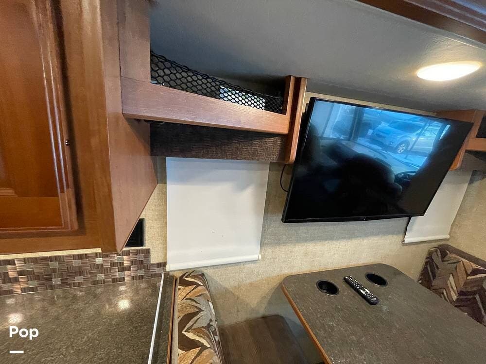 The dinette seats up to 6 and features storage under the seat benches. A flat-screen TV is mounted above the dinette table for viewing from within the living space.