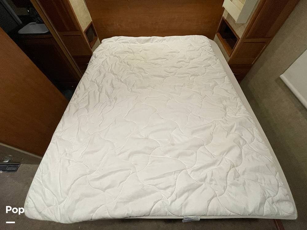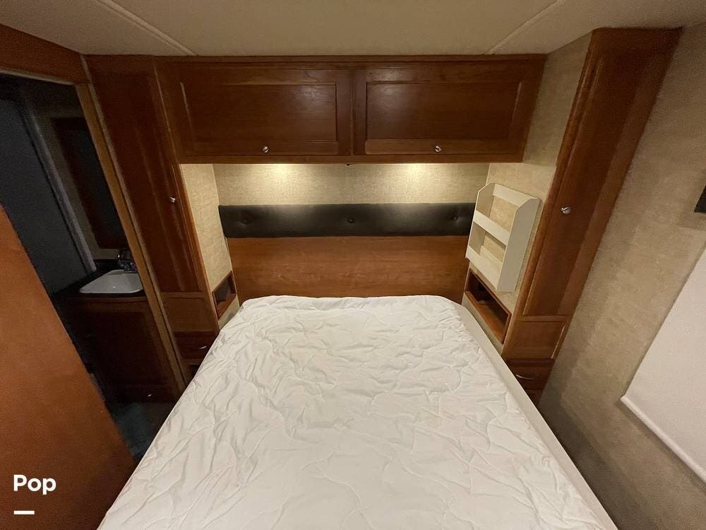 The queen bed is positioned with the headboard on the right side of the RV. There is cabinet storage above the headboard.