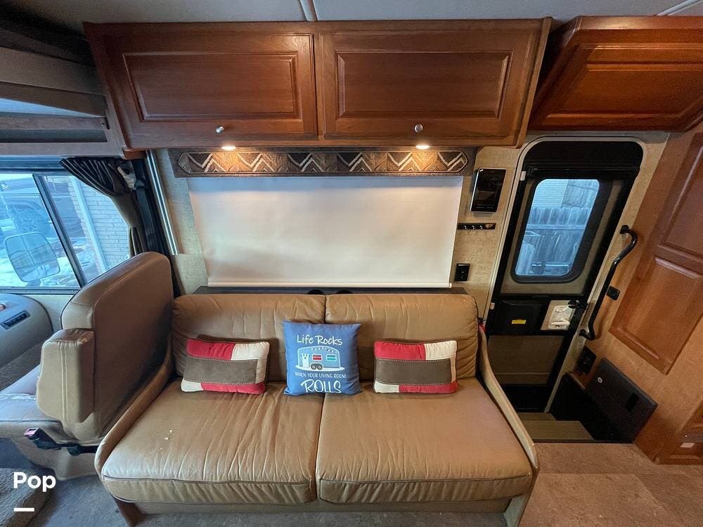 A sofa behind the passenger seat converts into a jackknife bed. A large window behind the sofa lets in natural light and fresh air. Overhead are storage cabinets.