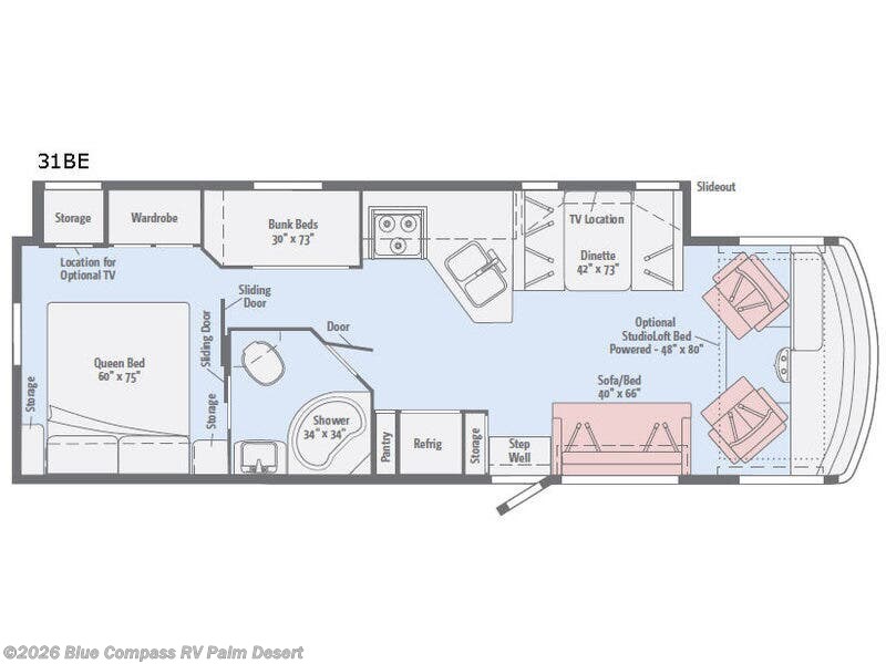 Step inside along the curb side of the coach and find a sofa/bed to your right that includes seat belts for safe traveling. There is an optional StudioLoft bed above the cab area that you can add giving you an additional 48" x 80" sleeping space for one. Across from the sofa/bed you will find added seating for meals at the 42" x 73" dinette with overhead cabinets above including a location for a 39" HDTV to enjoy. This too can become sleeping space at night when needed with the table folded down.