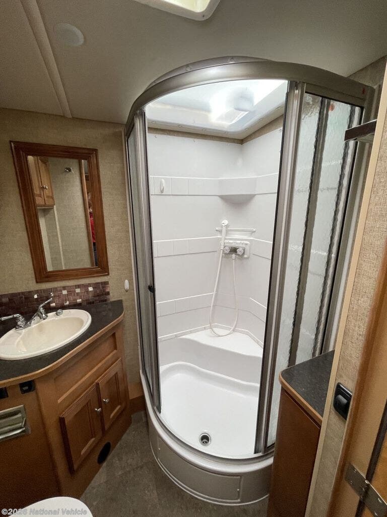 A convenient bath is located in the center of the coach and features a kidney shaped shower, corner sink, toilet, and storage cabinet.