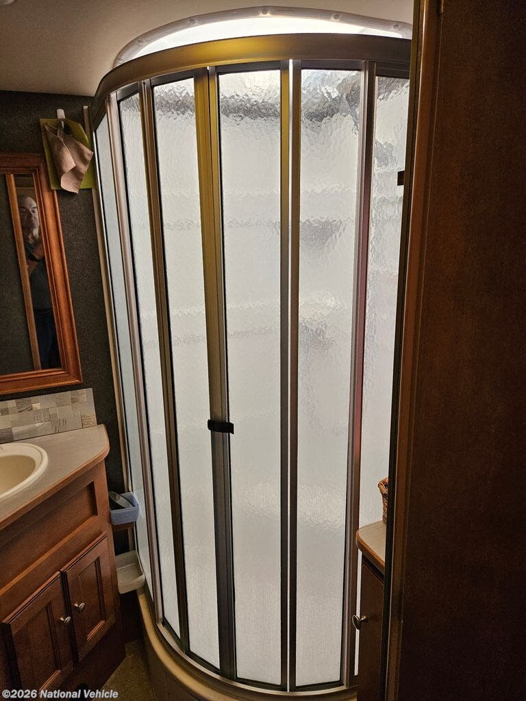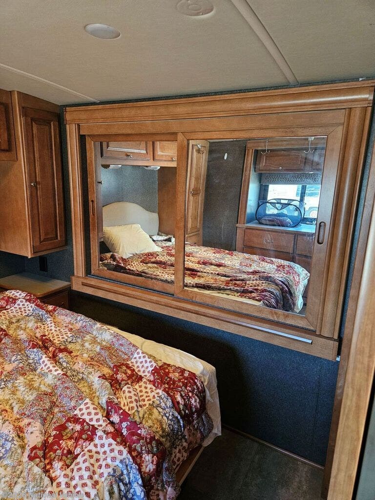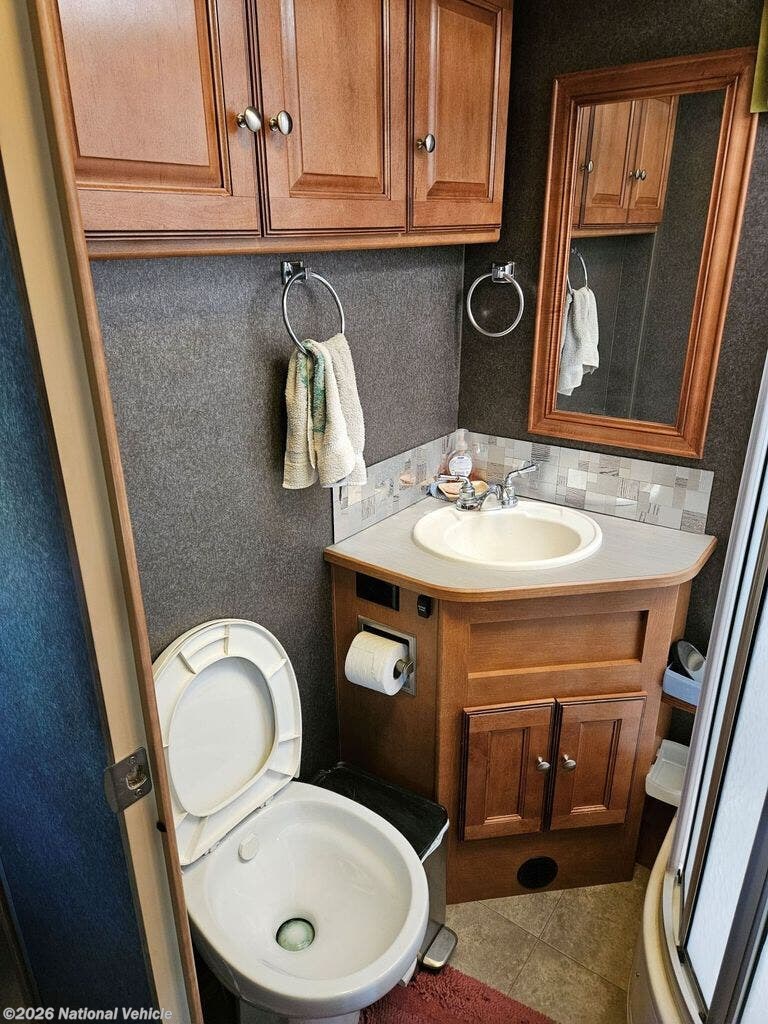 The mid-coach kitchen is both functional and stylish, equipped with a three-burner cooktop, microwave, mid-size refrigerator, and ample cabinetry. Solid-surface countertops and quality finishes add a residential touch, giving you everything you need to prepare meals on the road with ease.