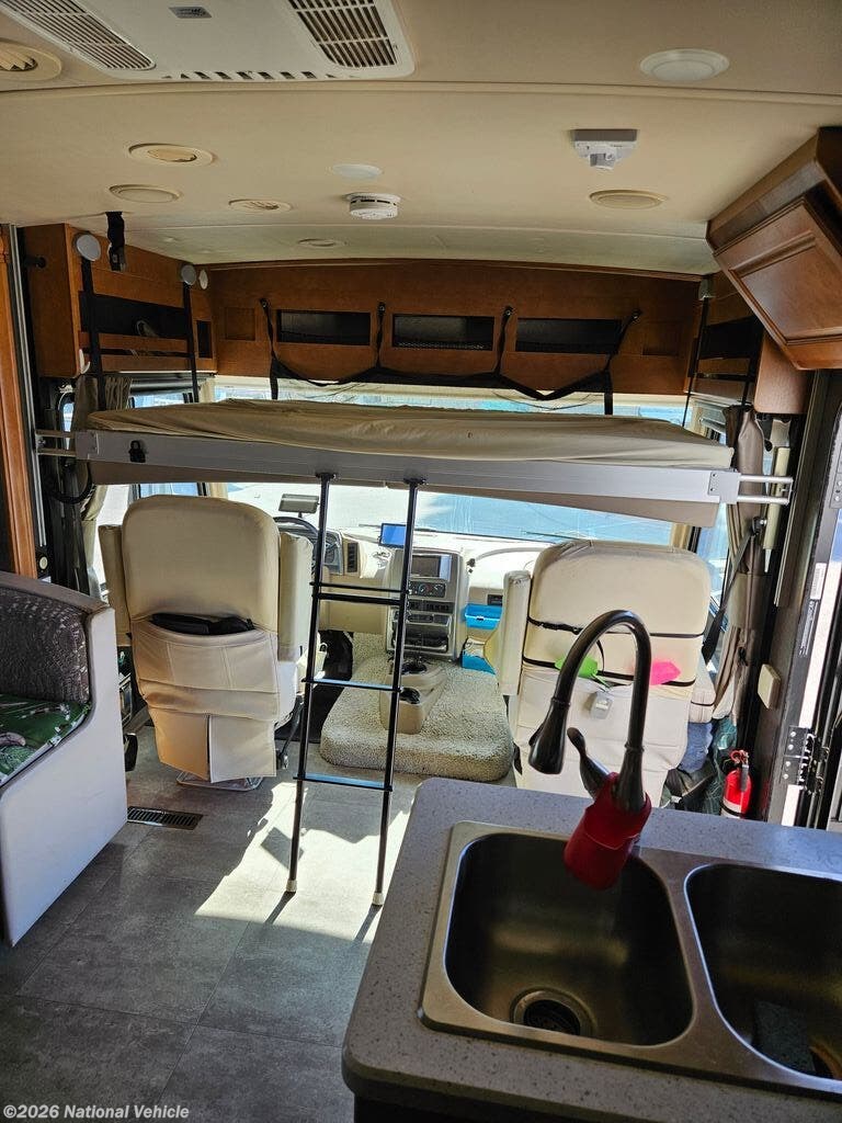 Inside, the thoughtfully designed 27N floorplan features three slide-outs that open up the living space, creating a roomy and inviting interior that comfortably sleeps up to five. The front living area offers plush seating, a dinette, and a full entertainment center, making it easy to relax or host guests after a day of travel. Large windows throughout bring in natural light and enhance the open feel of the coach.