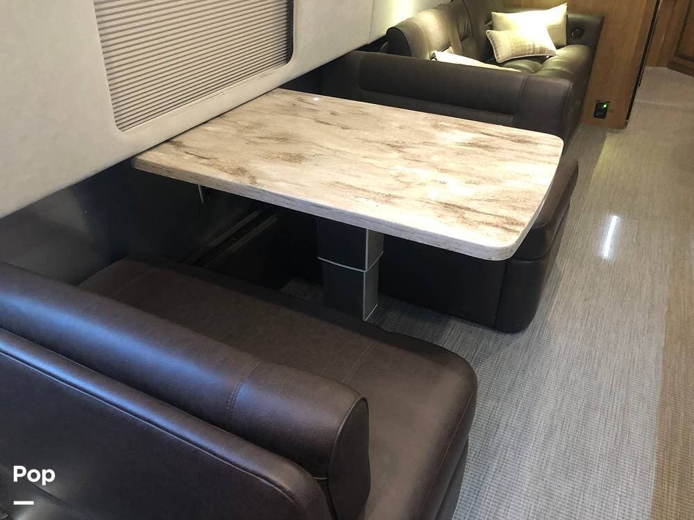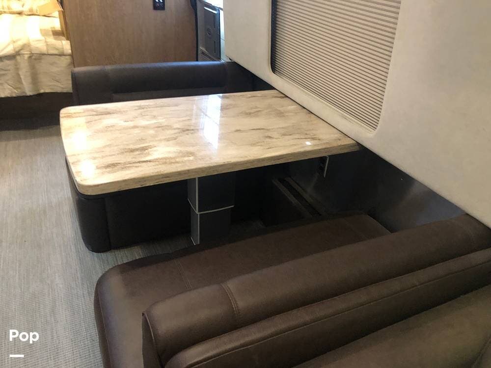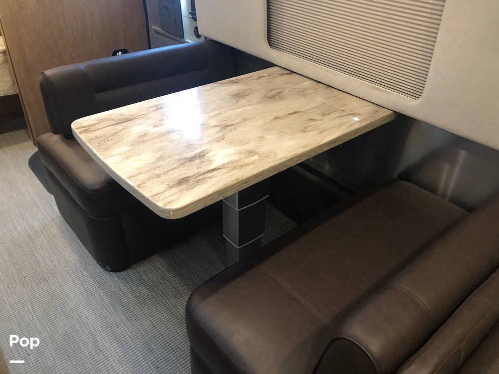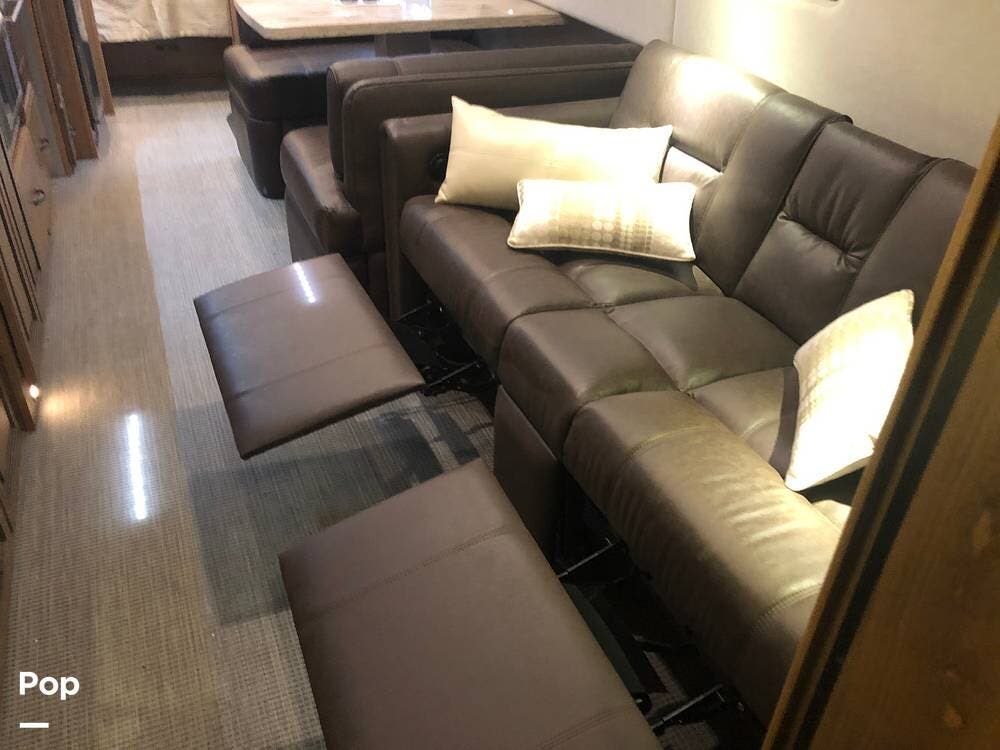 In the main living area, a dinette booth converts to a bed, and a sofa features two built-in footrests.